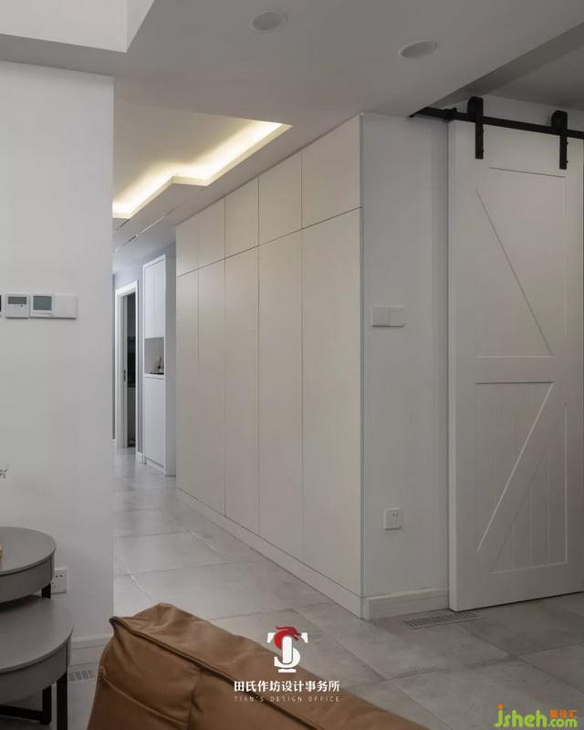 入戶長(zhǎng)型的走廊連通客廳、書房和次衛(wèi),一整面鞋柜隱于走廊的一側(cè),這片空間不顯山露水而又超乎想象。進(jìn)門干區(qū)的墻體改為柜體,方便回家時(shí)常用鞋子的更換和收納。
