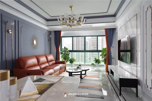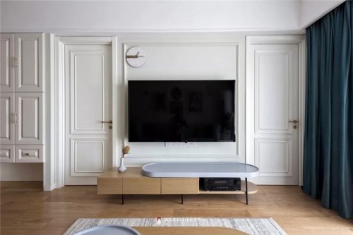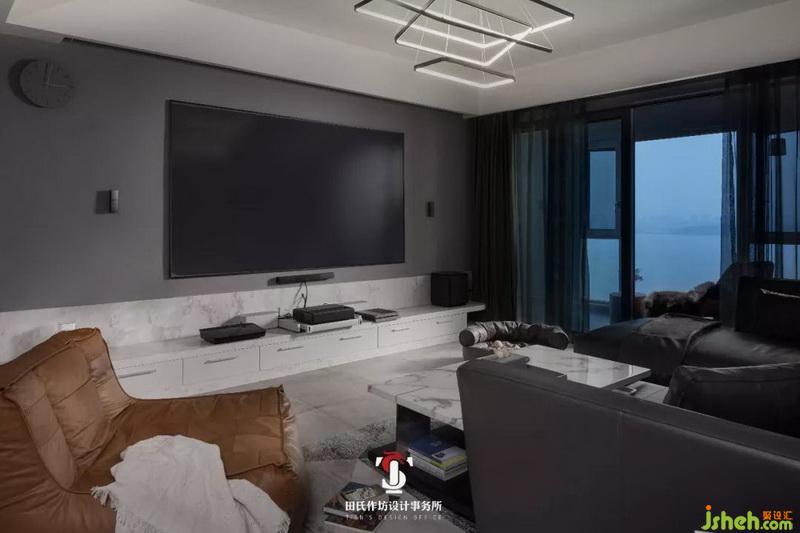 100寸的激光電視配上高端環(huán)繞式音響,將看電影,玩游戲的體驗(yàn)感達(dá)到了極致。電視下面是整排的儲(chǔ)物抽屜,白色大理石貼面,代替了限長(zhǎng)的電視柜,與較大的電視屏幕比例更加協(xié)調(diào)。整體顏色上面也有提亮的作用,讓空間的層次感更強(qiáng)。