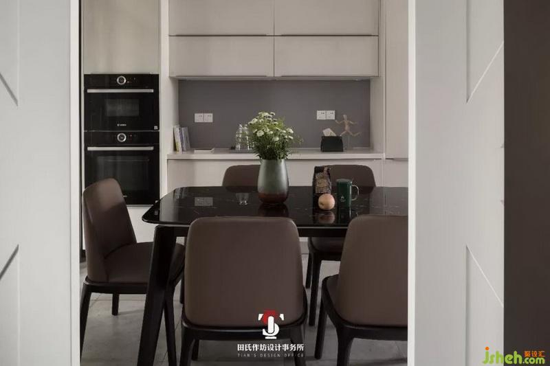 “滿紙沉墨,一笑若白,輕啟紅唇,溫存余久”與客廳大面積灰不同的是,餐廳區(qū)域以白色為主,顏色上對(duì)空間就已經(jīng)進(jìn)行了劃分,在這樣的空間中同樣能看到各種顏色與材質(zhì)的交織。