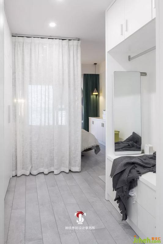 臥室、衣帽間和衛(wèi)生間的極致空間組合,簡(jiǎn)約的黑色邊框玻璃隔斷分隔主臥與衣帽間,米白色的紗簾若隱若現(xiàn)的遮擋,分隔與互動(dòng)的交織,現(xiàn)實(shí)與藝術(shù)的結(jié)合。
