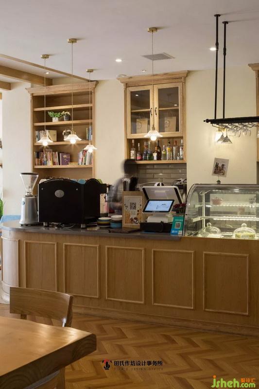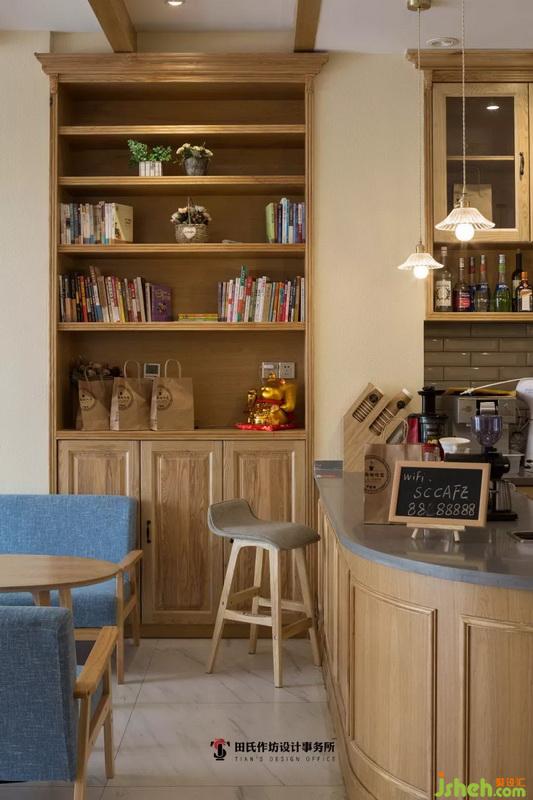 鏈條式的玻璃吊燈星星點點地裝飾著吧臺,室內(nèi)設(shè)計師使用暖黃的燈光烘托出咖啡屋的浪漫氛圍。樺木紋里的內(nèi)嵌式壁柜、暖調(diào)射燈的稱托、店主豐富的書籍積攢,這三元素的交織碰撞又增添了一抹歐美復(fù)古風(fēng)情。