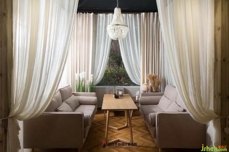 在這個分區(qū)中,最吸眼球的不過那面落地窗了,沙發(fā)的四周則以白色的半透明絲質(zhì)紗簾作為隔斷,頭頂?shù)木扌偷鯚粲赡ド安A蜕僭S的白貝母組成,在光源影響下,白貝母折射著微弱但又炫彩的光芒。