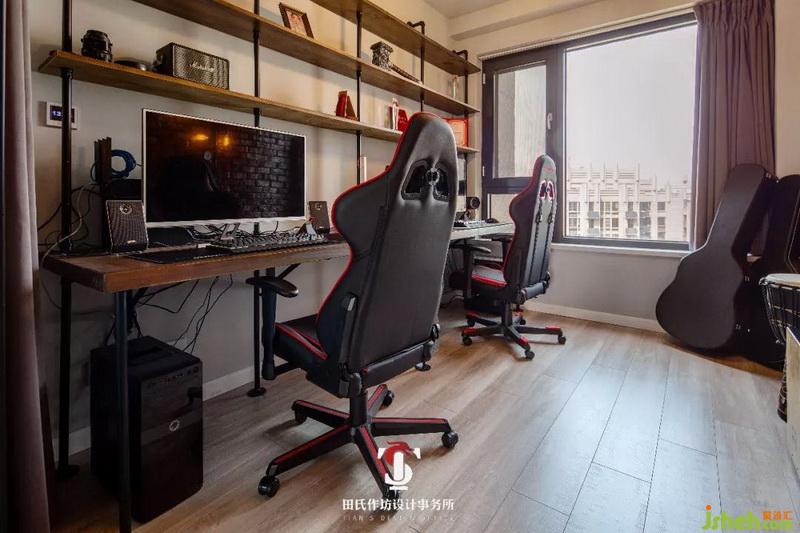 工業(yè)風(fēng)的書桌搭配上兩臺(tái)專為電競(jìng)而生的機(jī)器,專屬的電競(jìng)椅,整套的音響設(shè)備,可謂是每一個(gè)電競(jìng)?cè)说淖罱K夢(mèng)想,閑暇時(shí)刻這里就是男人們游戲戰(zhàn)場(chǎng)。