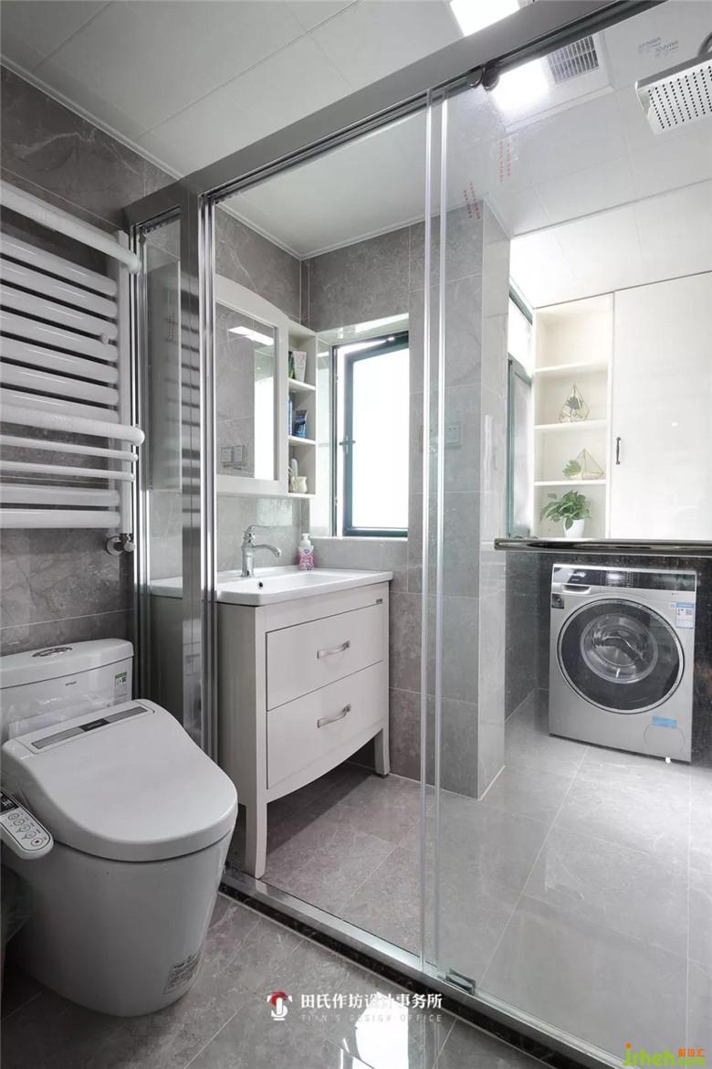 室內(nèi)設(shè)計(jì)師把原本從廚房進(jìn)入的小陽(yáng)臺(tái)劃分到衛(wèi)生間進(jìn)入作為一個(gè)洗衣區(qū),在衛(wèi)生間洗漱完換洗的衣物可以直接放入洗衣機(jī),方便了業(yè)主的日常生活;衛(wèi)生間做了淋雨隔斷更加方便打理衛(wèi)生。