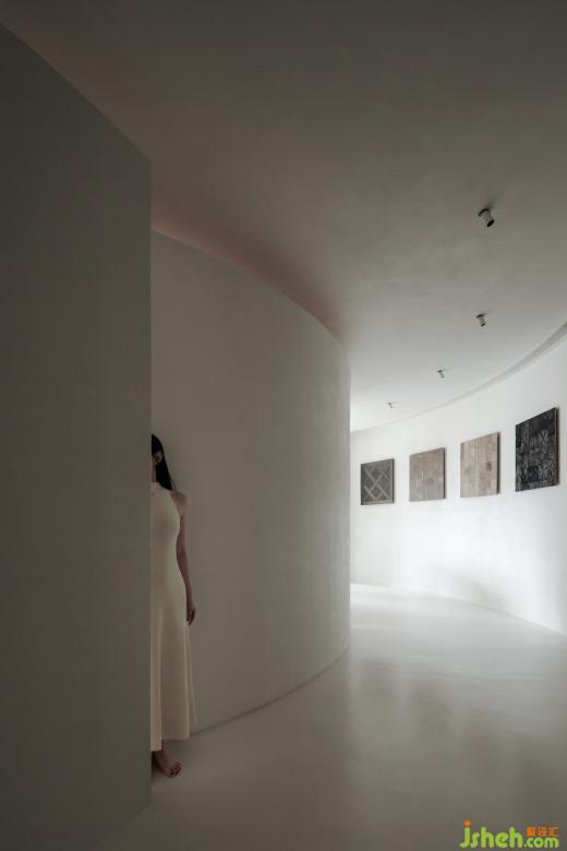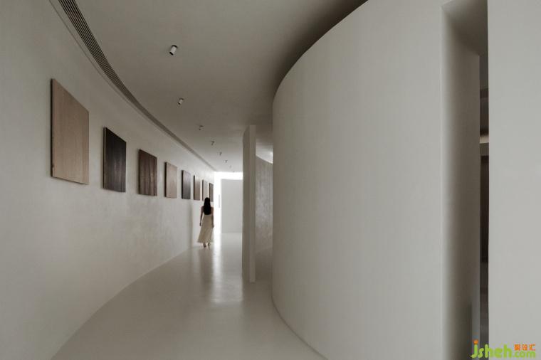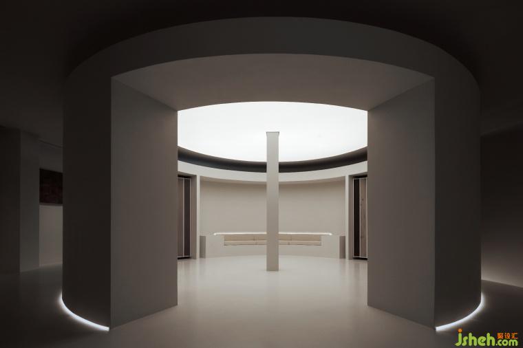 空間中的主動線也圍繞新置入的體量形成。兩個曲線片墻構(gòu)成的入口,在視覺上做了一定的遮蔽,讓人們無法一下看到空間的全貌,只能循著光逐漸在內(nèi)探索,被外圈的動線引導(dǎo)著逐步進入展廳內(nèi),一個寬容明亮的圓形展廳突然出現(xiàn)在眼前,豁然開朗。