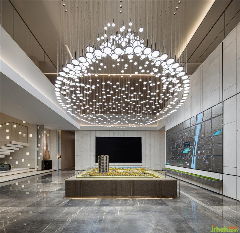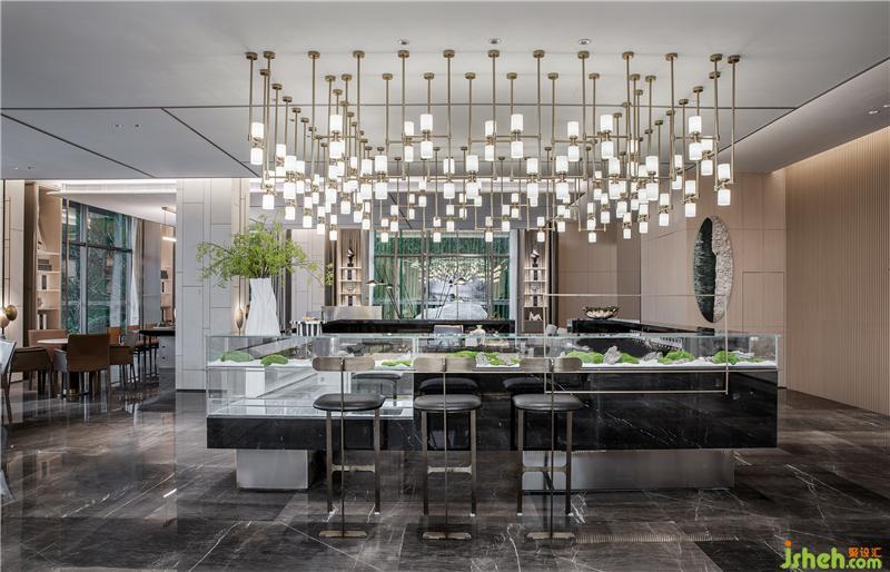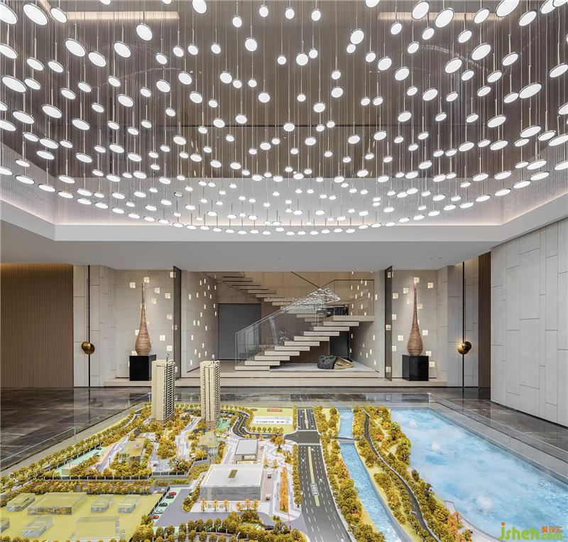 沙盤(pán)區(qū)至上而落的藝術(shù)燈具,以“水滴”漣漪在水中變幻形態(tài)為設(shè)計(jì)發(fā)想,輕盈飄逸。整體視覺(jué)空間形成聚焦,令觀者留下深刻記憶點(diǎn)。