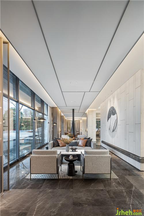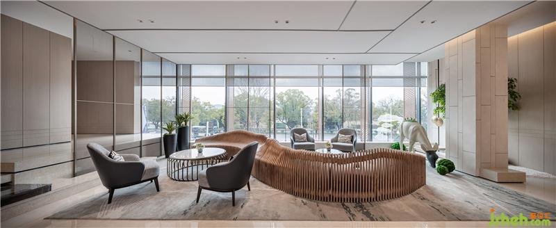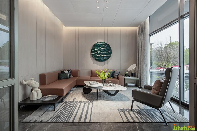 整個空間中最好的景致,莫過于緊鄰玻璃幕墻的洽談區(qū)域,外景引入室內(nèi),更烘托花墩坐月的意境。圓形畫面展示滿月狀態(tài),飾品營造彰顯坐態(tài)輕松。