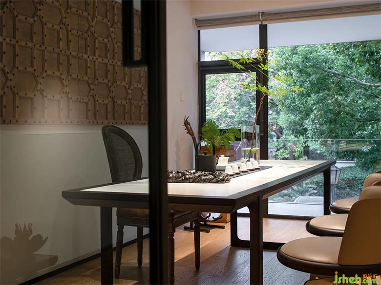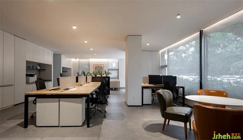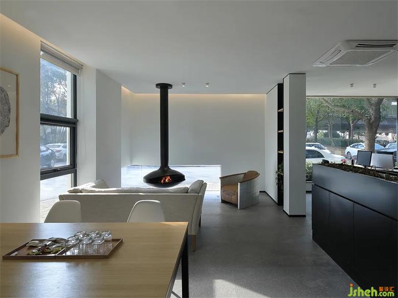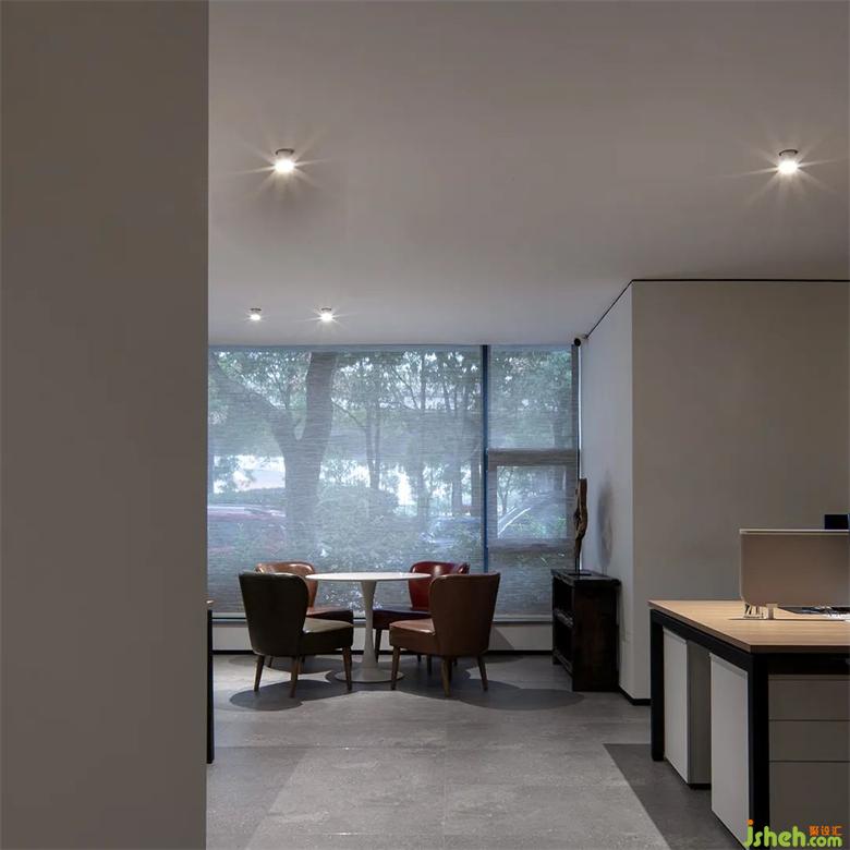 呈現(xiàn)設(shè)計并非是設(shè)計目的,恰好相反,很多空間內(nèi)所呈現(xiàn)的設(shè)計手法是為了達(dá)成特定的功能,事務(wù)所設(shè)計建筑主體的西南角保留了大部分的墻體,只在墻體下方做了局部透明的處理,看似運(yùn)用了某一種設(shè)計手法,但實(shí)際核心前提還是以考量功能和解決問題在先,西南角外圍是唯一沒有樹木遮擋的區(qū)域,這樣的處理即避免了西曬陽光的直射,同時又兼顧到采光問題及招牌的位置。