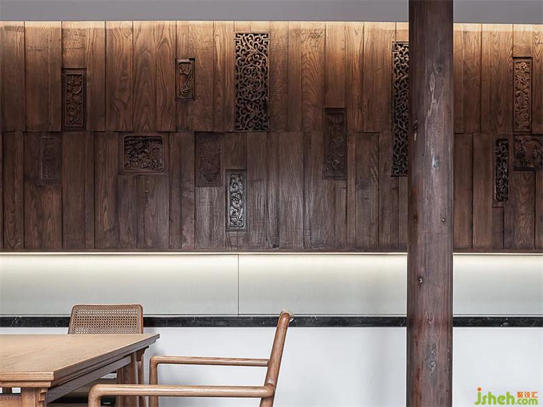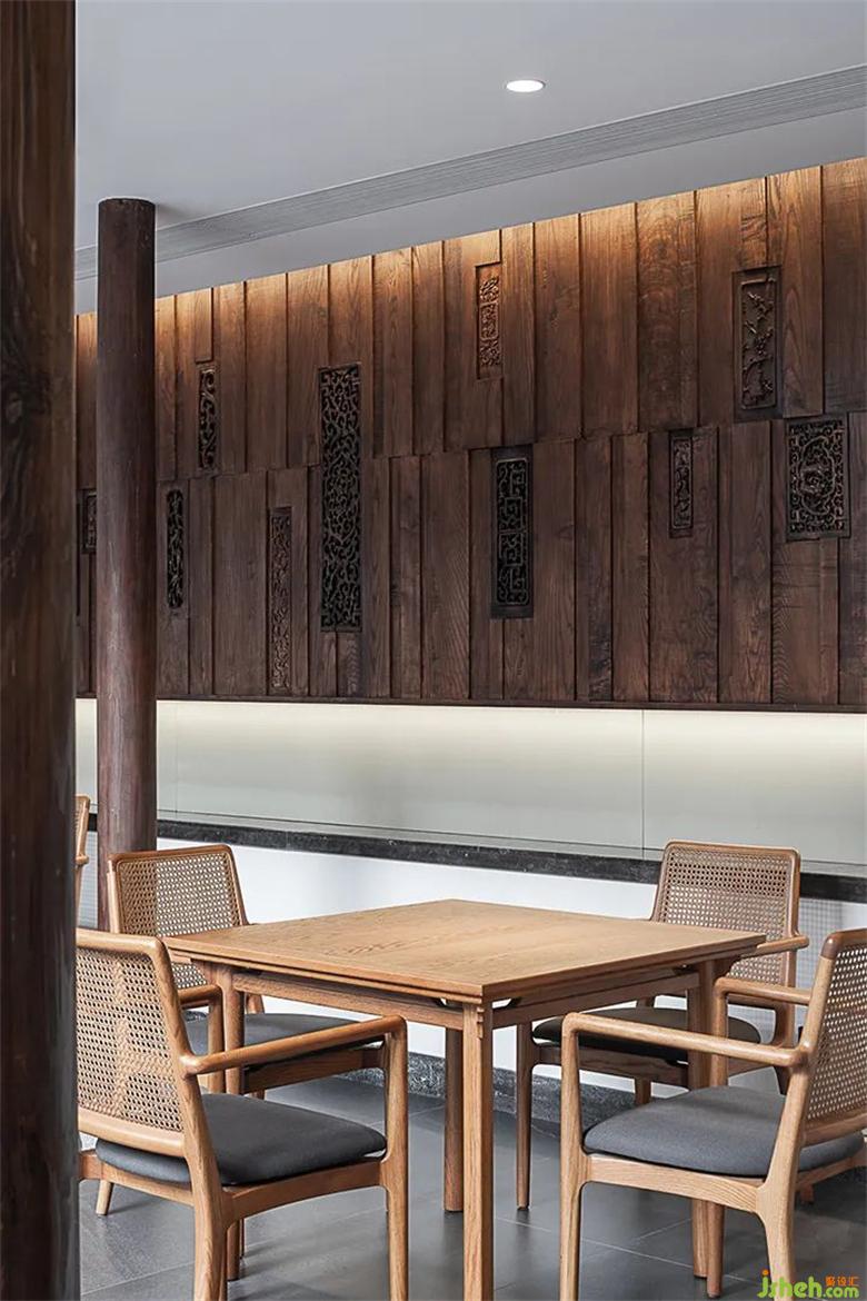 茶館設計用手刮漆打磨的方式去掉原有暗紅發(fā)黑的老漆,還原老木原有的紋理,同時去掉帶給空間陰暗閉塞的拙味感,老房改造在此基礎上又一次次調試定制透底漆,用來平衡老木原有質地的欠缺,木紋肌理的呈現(xiàn)以及和整體空間色調的和諧統(tǒng)一。
