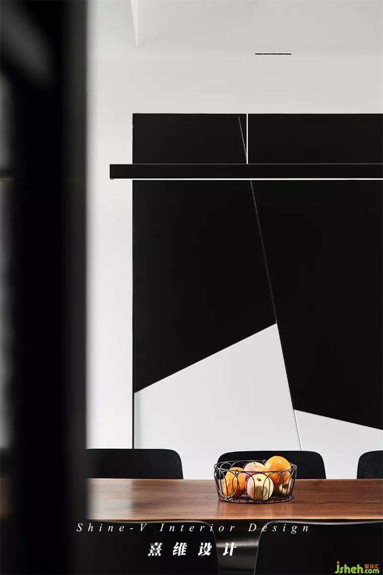 ▲以開放式的布局讓餐廳同樣可以享受到充沛的光線,使這片場(chǎng)域的視野也開闊起來。室內(nèi)設(shè)計(jì)師用幾何圖形肆意的規(guī)劃餐廳背景墻,賦予空間變化,間富有層次。當(dāng)然這面背景墻不僅僅是裝飾,也是用于電箱的遮蔽和儲(chǔ)物。