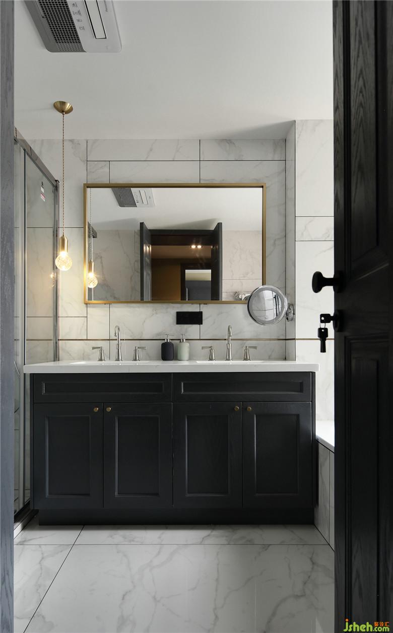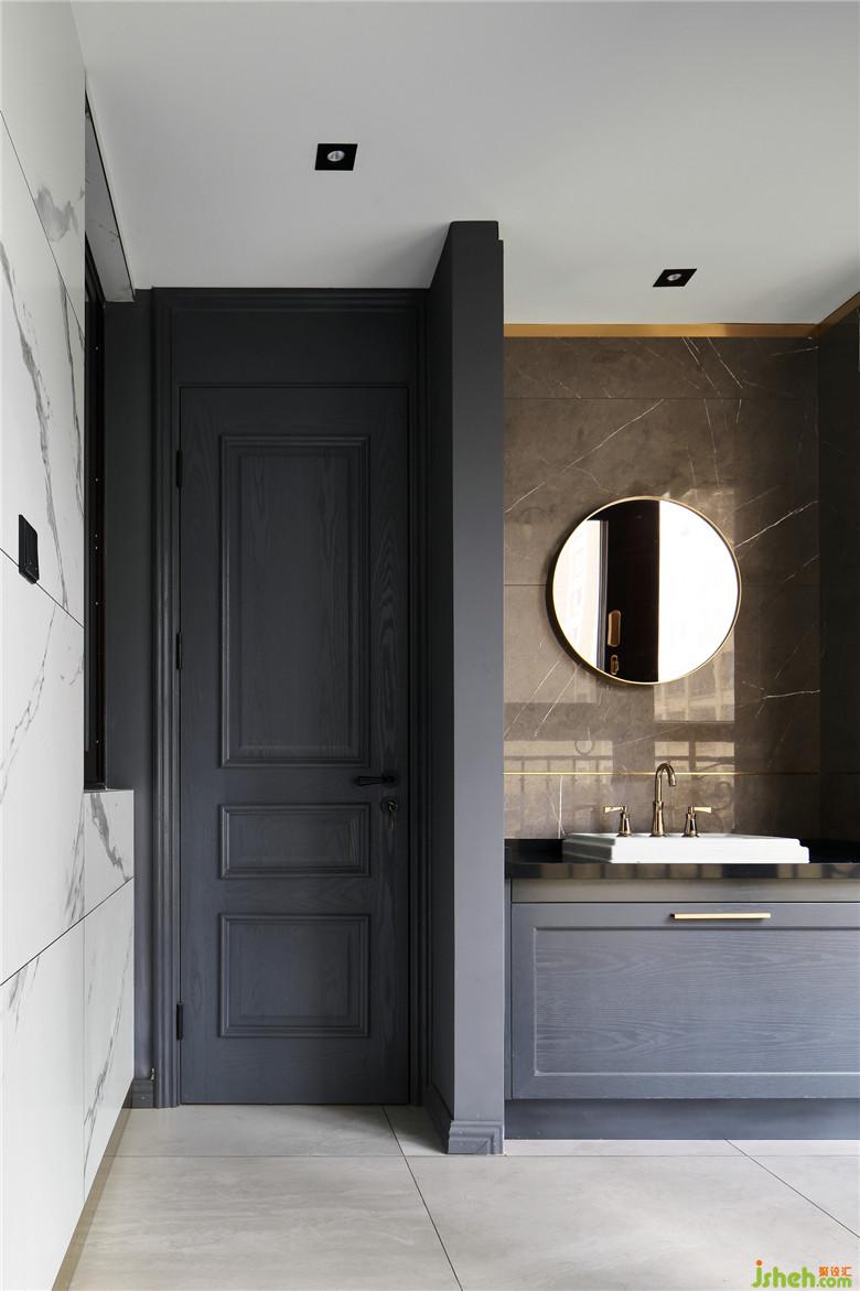 客衛(wèi)的干區(qū),做了臺(tái)盆干濕分離的設(shè)計(jì),配色上采用大面積深色仿石材瓷磚搭配金色元素,延續(xù)了整屋的深灰色元素。全屋的門套線均是做到頂,視覺上拉升了房屋的高度。整體灰色調(diào)搭配金色點(diǎn)綴,增加了一份寧靜和優(yōu)雅!室內(nèi)設(shè)計(jì)師