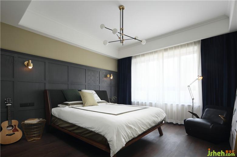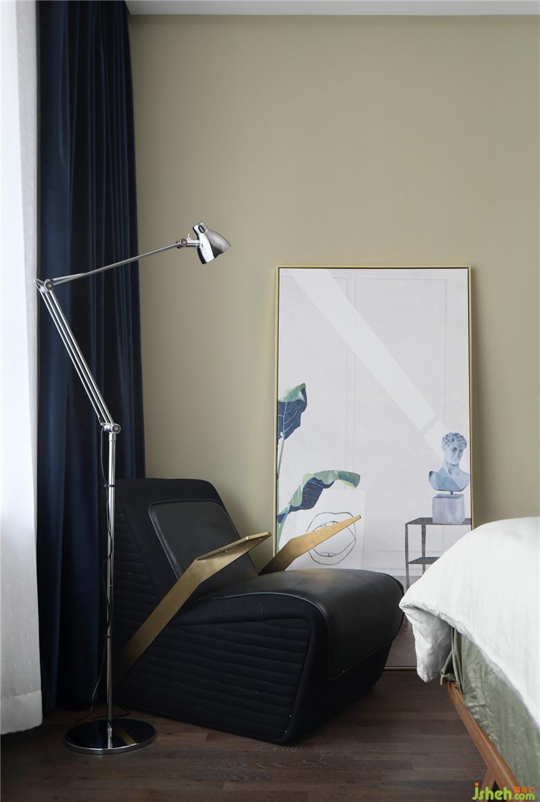 主臥的背景墻設(shè)計(jì)依舊延續(xù)了客餐廳的灰色設(shè)計(jì)元素,使用高位的護(hù)墻板以達(dá)成整體的風(fēng)格統(tǒng)一性,深色的窗簾可以增加睡眠的舒適度。角落的單人沙發(fā)搭配宜家的落地?zé)簦蔀榱宋葜髯類鄣拈喿x角。