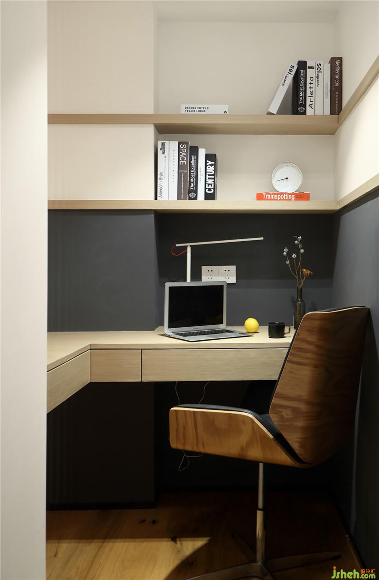 ▲定制的實木隔斷替代了原始戶型結(jié)構(gòu)中的實墻,室內(nèi)設(shè)計師將這個狹小空間改造成了半開放的小書房,虛虛實實,明明暗暗,小空間有了新生。小書房定制的挑板型書架結(jié)+書桌,結(jié)合戶型中存在的立柱加以充分利用。墻面一半刷白色乳膠漆,一半刷深灰色黑板漆,小書房因而更顯精致。
