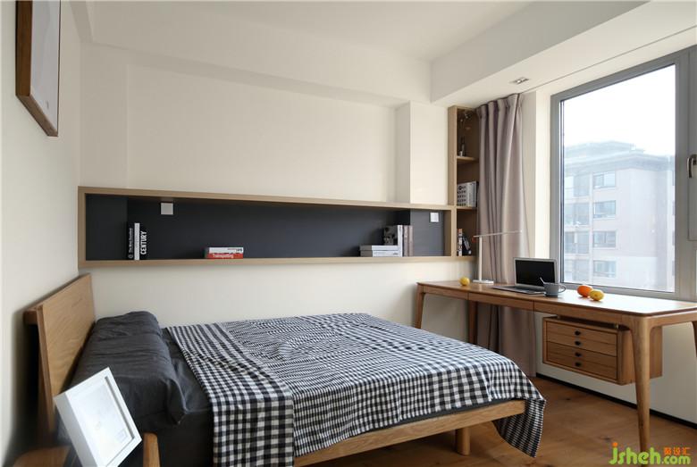▲兒童房面積較小,室內(nèi)設(shè)計(jì)師敲掉整個(gè)飄窗,為這塊區(qū)域增加了書(shū)桌的空間,并結(jié)合戶型中的原有立柱,現(xiàn)場(chǎng)定制挑板書(shū)架+涂刷黑板漆,小空間也滿足了所有的功能性。