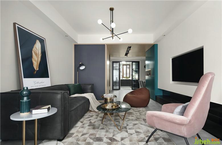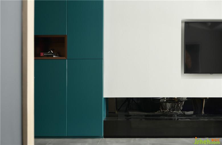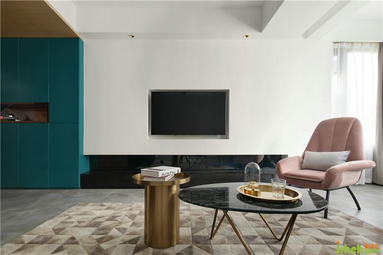 ▲從陽臺向客廳望去,室內(nèi)設(shè)計師以飾面板為分界包裹的餐廳區(qū)域——從立面到頂部由木工板基層外貼飾面板,形成獨(dú)立區(qū)域。藍(lán)綠色的儲物柜形成了客餐廳之間的聯(lián)系與轉(zhuǎn)折,與客廳電視背景墻的大量留白形成趣味性碰撞,簡約卻不簡單。而粉色絲絨單椅的加入,也讓空間溫柔下來,達(dá)到一種平衡狀態(tài)。