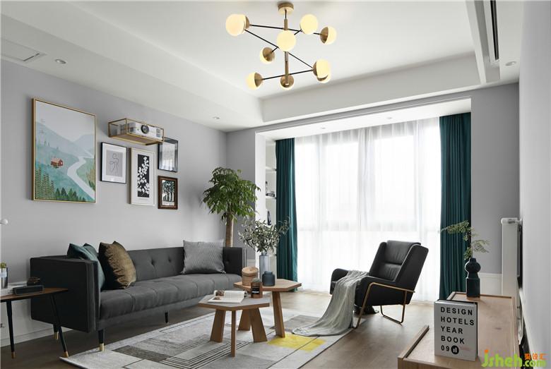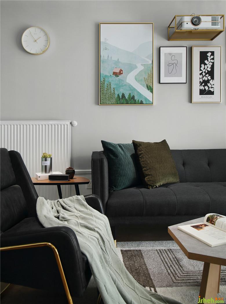 ▲將原戶型陽(yáng)臺(tái)并入客廳擴(kuò)大區(qū)域,也增加了客廳的采光使之更通透溫暖。室內(nèi)墻體以淺灰色為底,室內(nèi)設(shè)計(jì)師以深色家具作為重色壓住整個(gè)空間,將屋主喜愛的綠色貫穿到室內(nèi)裝飾上,裝飾畫、抱枕亦或是窗簾,都與全屋和諧的搭配著。