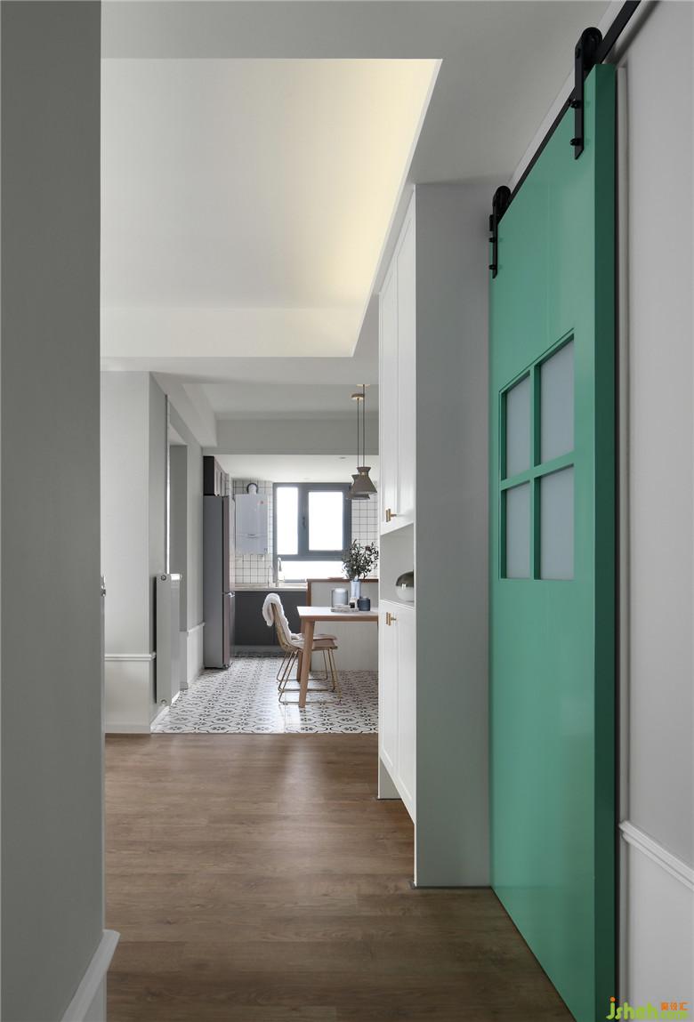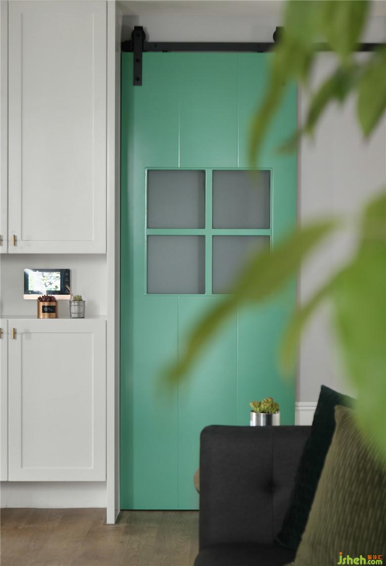 ▲入戶左手邊是定制的鞋柜,白色的柜體與旁邊的綠色谷倉(cāng)門相得益彰。室內(nèi)設(shè)計(jì)師將公共空間以低矮的白色護(hù)墻板圍繞,增加室內(nèi)的美觀性的同時(shí)讓墻面形成層次感??蛷d設(shè)置投影儀,六邊形的木質(zhì)組合茶幾,幾何形地毯與舒適的布藝沙發(fā),一家人可以悠閑地享受家庭影音時(shí)光,客廳是能夠放松下來(lái)休憩的空間。