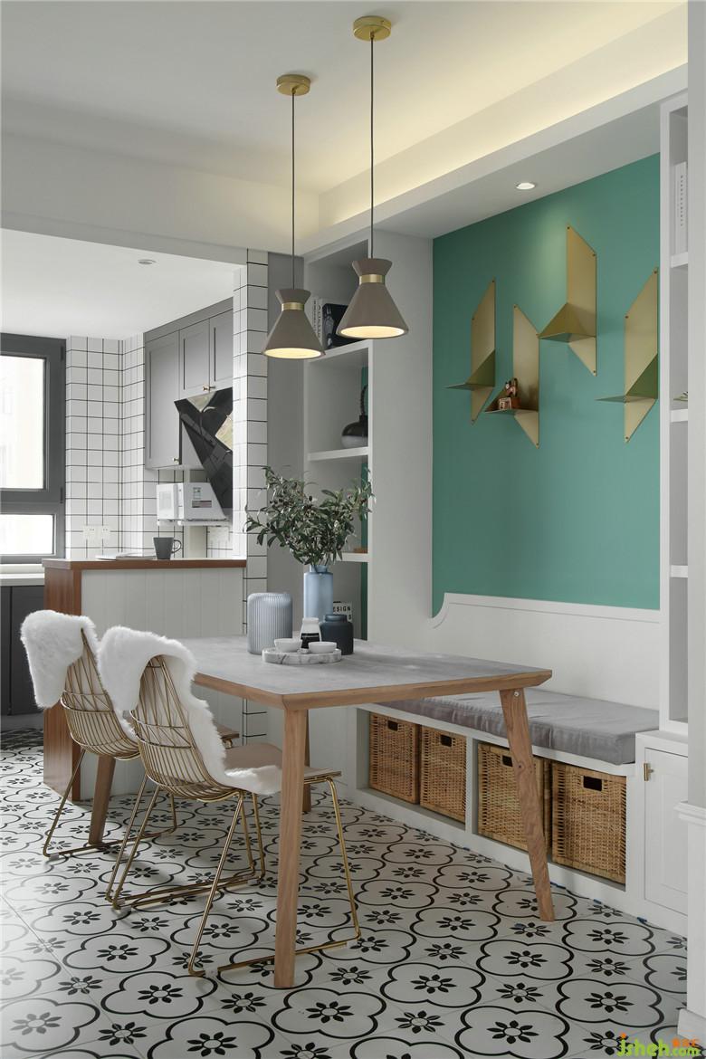 ▲餐廳室內(nèi)設(shè)計(jì)師利用卡座形式,是能夠滿(mǎn)足多人用餐并且具有收納功能,同時(shí)又不失空間上的設(shè)計(jì)美感。滿(mǎn)足屋主需求在廚房與餐廳之間增設(shè)吧臺(tái),也是作為兩個(gè)功能區(qū)之間的過(guò)渡與隔斷。餐廳、廚房區(qū)域以花磚進(jìn)行鋪貼,在這片以純色為主的空間中,結(jié)合造型簡(jiǎn)潔的木質(zhì)餐桌搭配金屬餐椅,讓空間更具變化性及層次感。