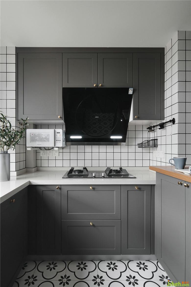 ▲室內(nèi)設(shè)計(jì)師為了使空間更為通透、寬敞,打掉了原戶(hù)型的廚房墻體,定制的櫥柜在顏色運(yùn)用上搭配整體空間,開(kāi)放式廚房在布局上和諧統(tǒng)一,延伸視覺(jué)感。