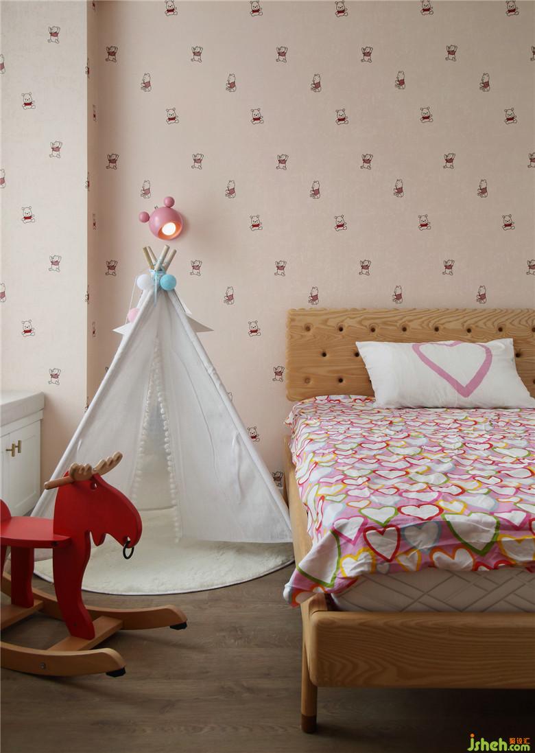 ▲女兒房選用了粉色的維尼熊墻紙,很是可愛(ài)了。盡可能給孩子一些玩??臻g,小帳篷、小木馬和墻上的米奇頭壁燈,體現(xiàn)了兒童房的活潑性。