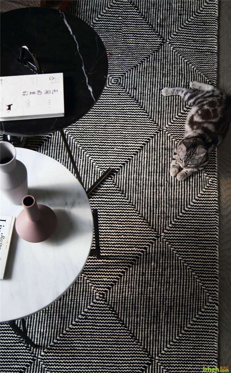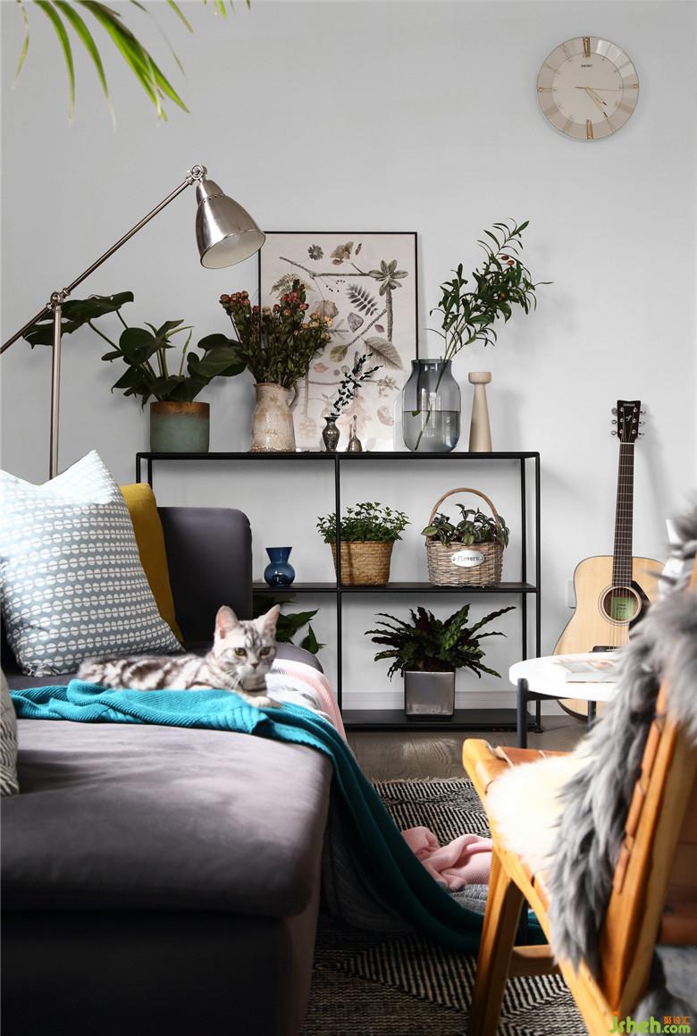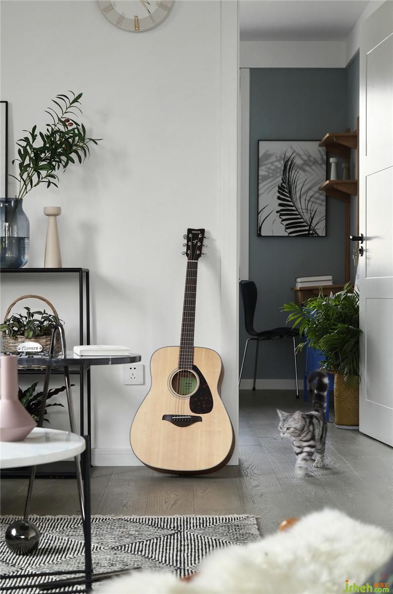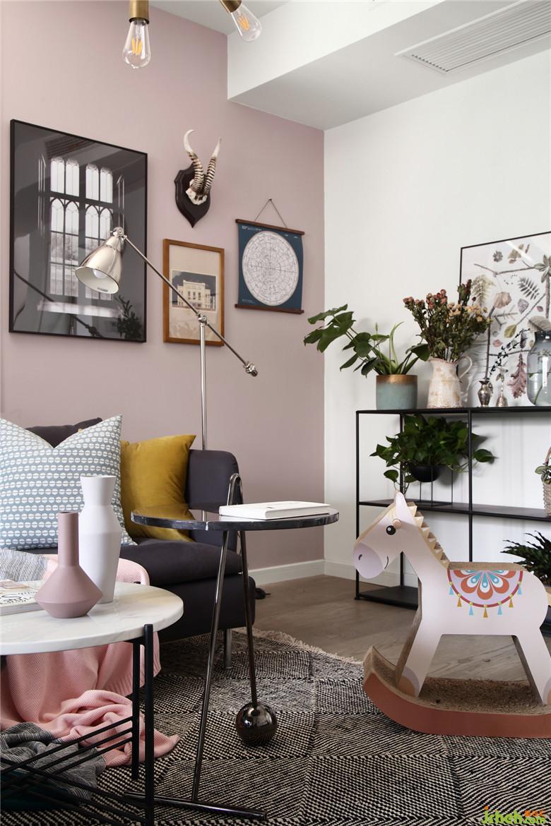 ▲在這個面積并不開闊的空間里,室內(nèi)設(shè)計師將不同的元素進行著比對,而黑色金屬線條的置物架,不僅滿足了展示收納功能,也不顯得空間擁擠,恰到好處的交織出奇妙的平衡感。屋主夫婦的內(nèi)心一定是柔軟而充滿童趣的,粉色木馬仿佛回到了童年,彈著木吉他,有一只他和她的貓。