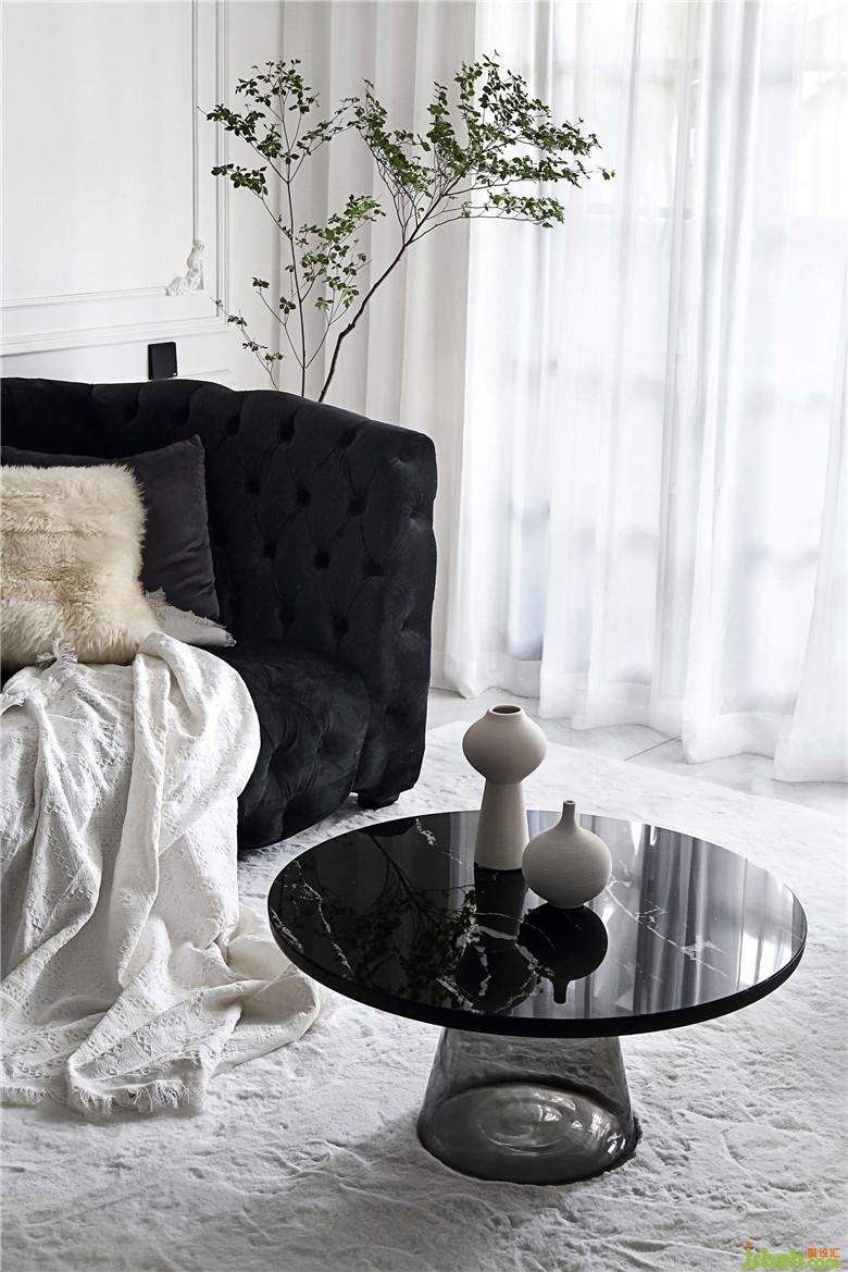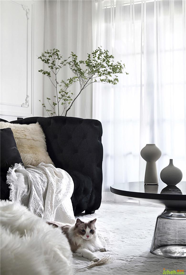 細(xì)枝綠葉總是宜人的,白墻上的石膏線條像是畫框,無飾的雪紡窗簾讓光線透進(jìn)來,映出茶幾的大理石紋就很有天然的質(zhì)感。