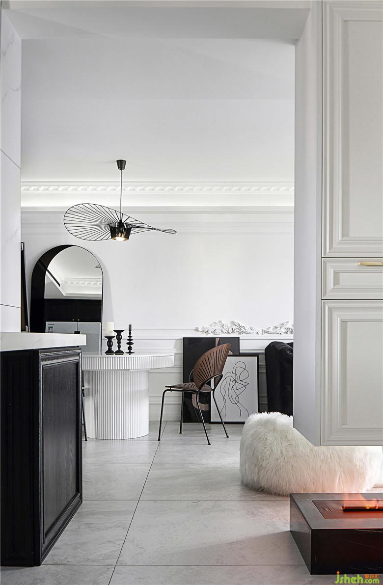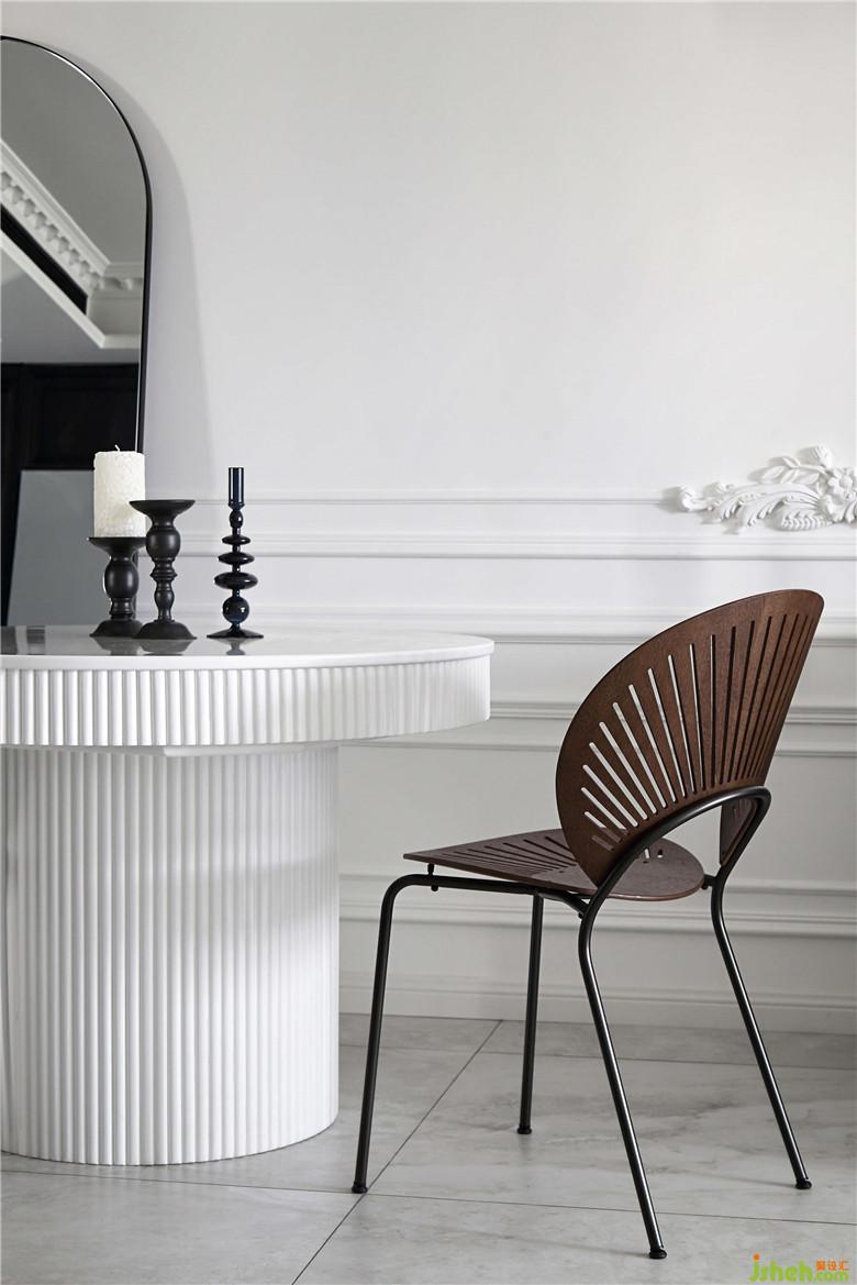 餐廳的墻面一面是黑色柜體的收納空間,另一面是連著客廳部分的回形線條白墻,黑白的搭配視覺感十分鮮明??繅Χ⒌墓伴T形的鏡子,產(chǎn)生奇妙的穿越感,好像可以穿過鏡子走到另一面。造型別致的草帽吊燈和孔雀椅雖然顏色上并不亮眼,夜晚開燈的時(shí)候會(huì)投下好看的光影,室內(nèi)設(shè)計(jì)師讓餐廳的黑白空間之中線條層次更具節(jié)奏,給人一種文藝電影的即視感。