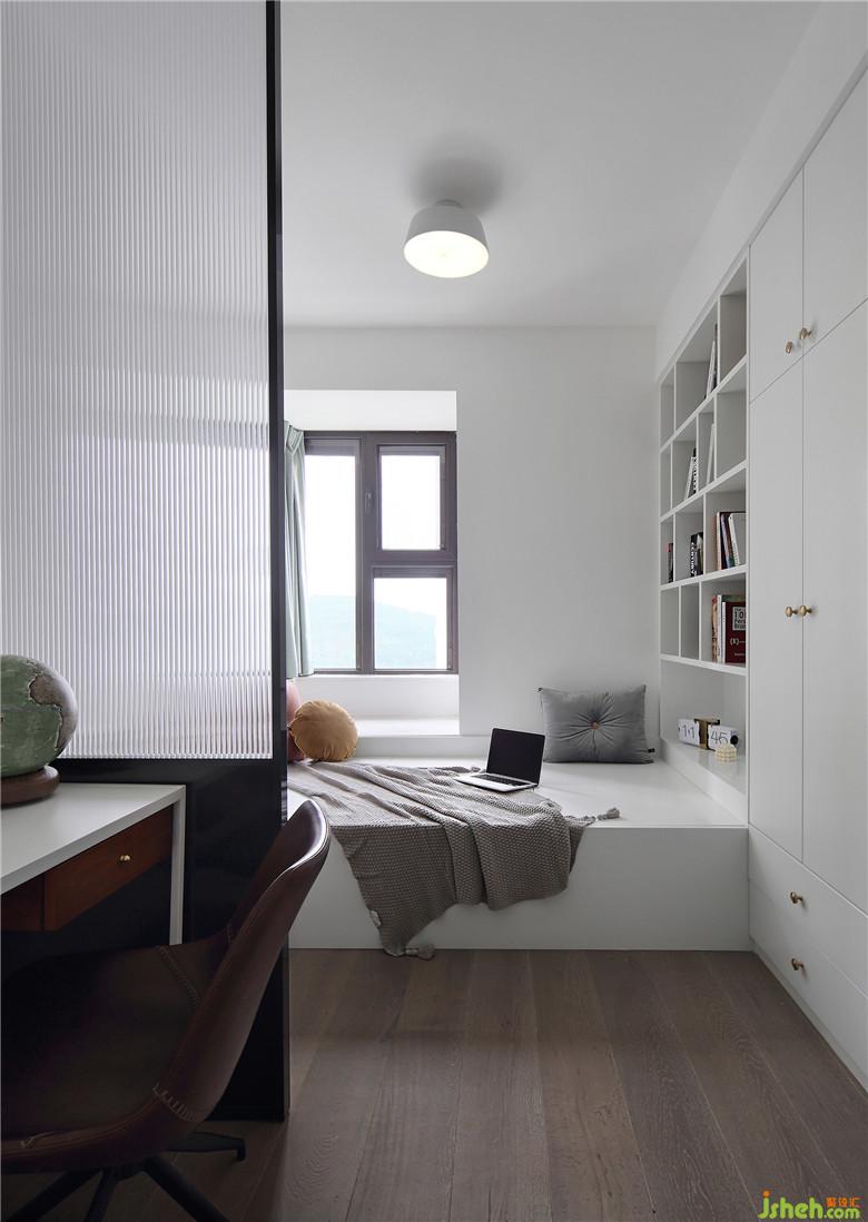 榻榻米和工作區(qū)做了長(zhǎng)虹玻璃的半隔斷,不會(huì)影響采光。設(shè)計(jì)師將休閑區(qū)設(shè)計(jì)成收納柜結(jié)合書(shū)架、榻榻米的形式,與飄窗連在一起,多功能的集合讓原本面積不大的休閑區(qū)滿足了生活中的多種需要。