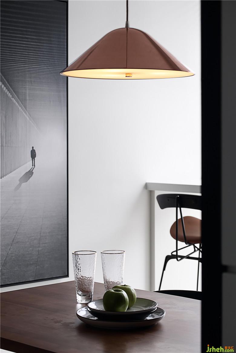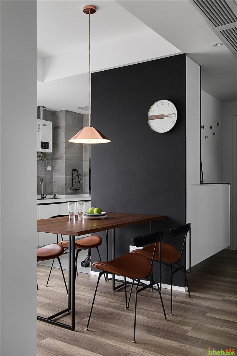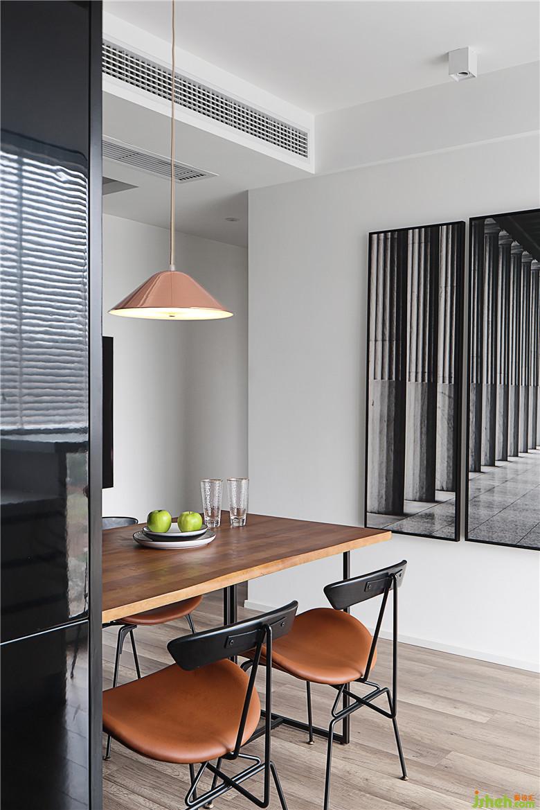 ▲餐廳兩側(cè)的墻面一黑一白,黑白之中又點(diǎn)綴白黑,互相對(duì)立又互相融合,簡(jiǎn)約的風(fēng)格下沉淀質(zhì)感,室內(nèi)設(shè)計(jì)師讓餐廳的光線(xiàn)更趨于柔和。loft風(fēng)格的餐桌是胡桃木與鐵藝的結(jié)合,餐椅是皮質(zhì)結(jié)合鐵藝,不厚重卻仍有鋒芒。玫瑰金的吊燈,小小一盞卻可以在黑白的空間中點(diǎn)亮溫馨。