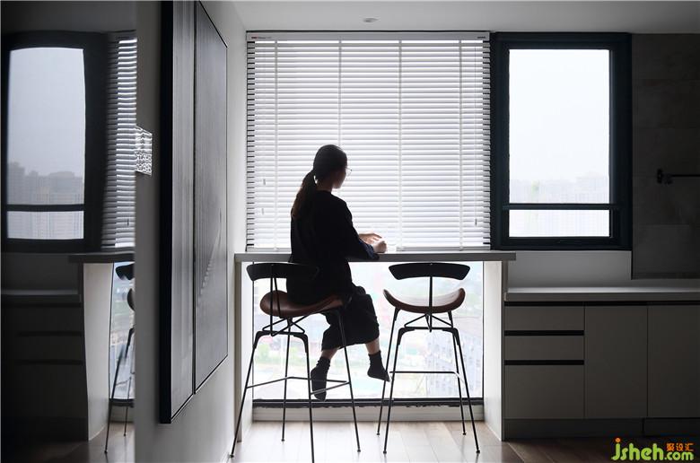 ▲室內(nèi)設(shè)計(jì)師將原陽(yáng)臺(tái)改造成沿落地窗設(shè)立的吧臺(tái),與開(kāi)放式廚房的櫥柜相連,窗外的景色納入眼前佐餐下飯,也讓公共空間的南北更加通透。