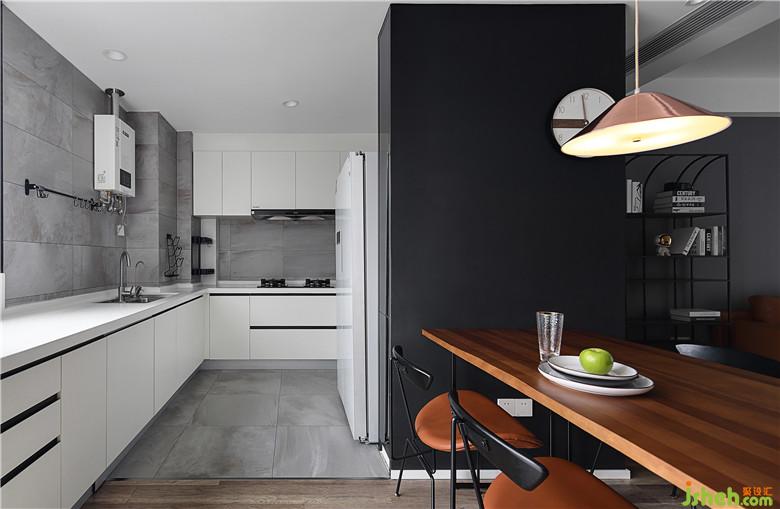 ▲整個(gè)餐廚區(qū)域都是相通的,空間利用率極高。廚房白色櫥柜的選擇讓廚房明亮之余,也與一側(cè)的黑色墻體形成節(jié)奏感,融入整個(gè)空間的黑白樂(lè)章之中。