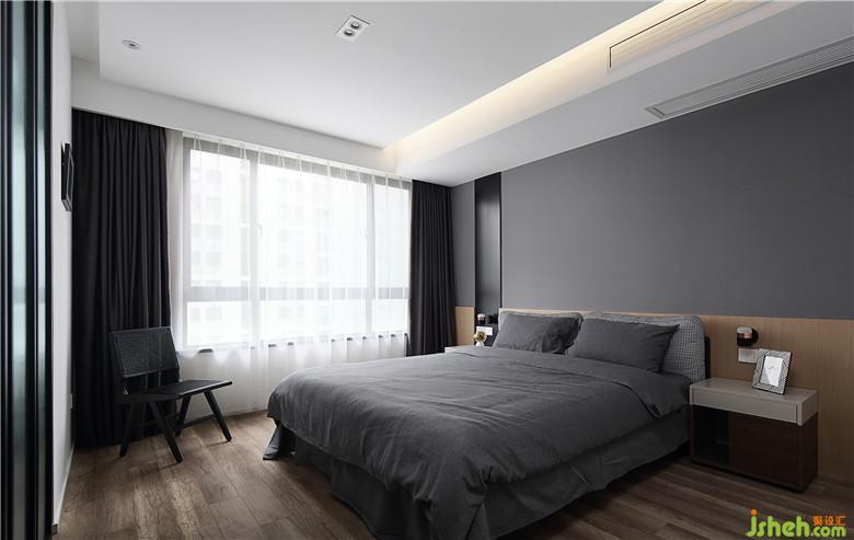 ▲主臥由兩間臥室合并而成,空間增大功能也更加完整。避免黑白色的沖擊力,主臥室內(nèi)設(shè)計(jì)師選用的主色調(diào)是灰色,柔和讓人放松。床頭背景除了灰色還搭配原木色護(hù)墻板與黑色混油裝飾塊面,讓灰色不再單調(diào),主臥氛圍走向柔和寧?kù)o。