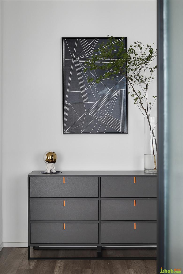 ▲主臥的一角,啞光材質(zhì)的斗柜低調(diào)內(nèi)斂,撞色的把手將這安靜的片隅點(diǎn)亮。