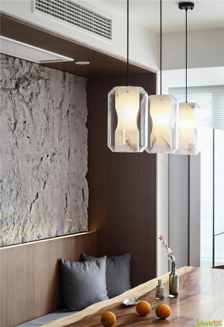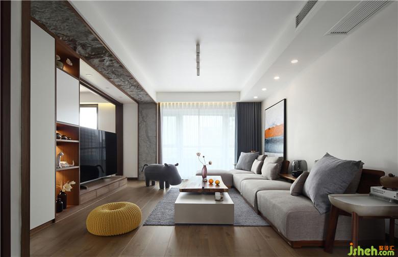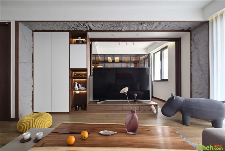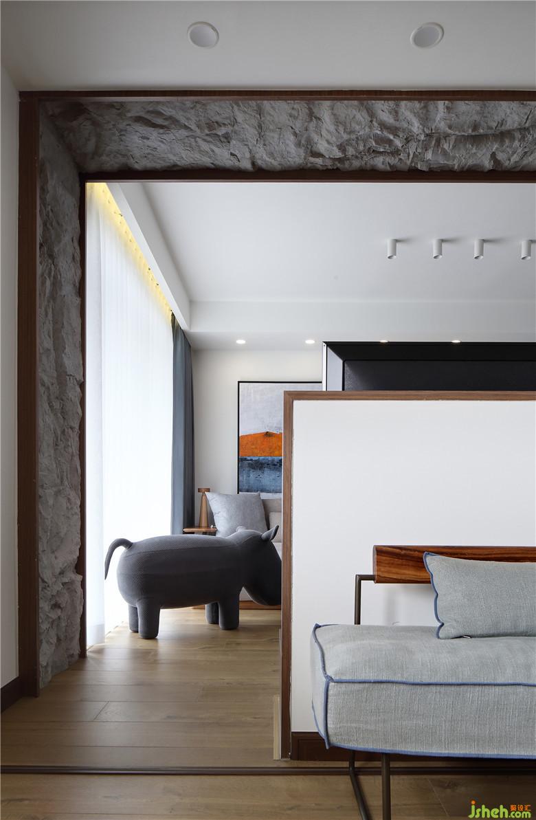 客廳空間渲染出大塊大塊的白色,是簡(jiǎn)約、干凈的底色。設(shè)計(jì)師將電視背景墻設(shè)計(jì)成了有趣的一部分,一半封閉一半通透,視覺(jué)上產(chǎn)生了微妙的平衡。既不會(huì)有完整一塊撲面而來(lái)的擁堵感,也不會(huì)有將休閑區(qū)暴露無(wú)遺的尷尬,客廳與休閑區(qū)連接著是半遮半露的自由與內(nèi)斂氣息。考慮到也有分隔的需要,設(shè)計(jì)師選用了折疊門,隱秘和自由都可以擁有,拉上之后可以作為獨(dú)立客房使用。為了豐富電視背景墻的視覺(jué)效果,室內(nèi)設(shè)計(jì)師采用了新材料,將玻璃纖維處理成石頭的肌理,噴上石粉,嵌入電視背景墻的外框中,與白色的柜體,胡桃木的包邊組合,是自然、質(zhì)樸的風(fēng)貌。