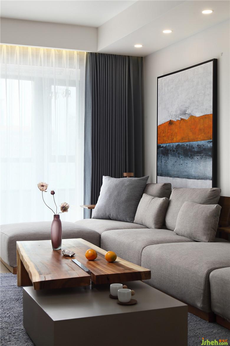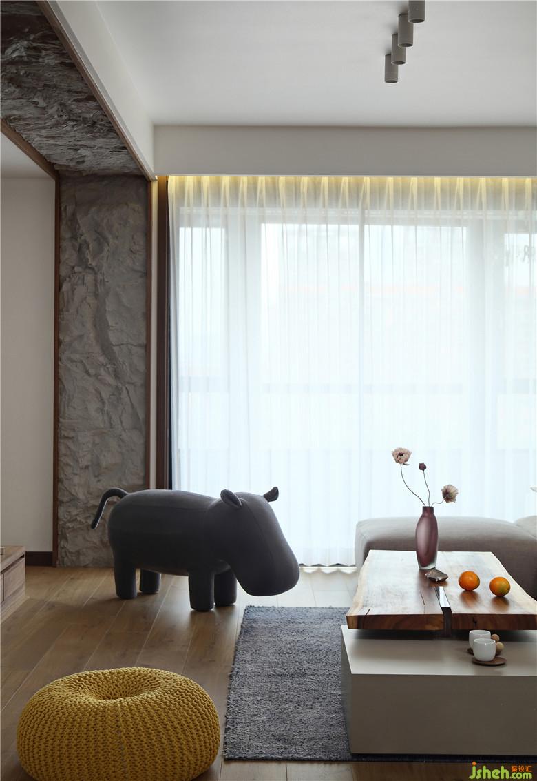 業(yè)主偏愛(ài)天然材質(zhì)、素雅的顏色。原木材質(zhì)沒(méi)有過(guò)多裝飾的茶幾,是與整體風(fēng)格契合的,帶著些微古意的淡雅,身處其中頗有菊影疊疏籬的意味。色彩強(qiáng)烈的裝飾畫只擺在沙發(fā)一角,河馬形態(tài)的沙發(fā),凝聚了和煦的溫暖氛圍。