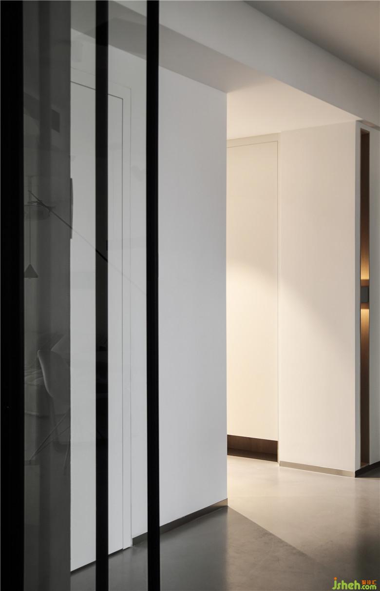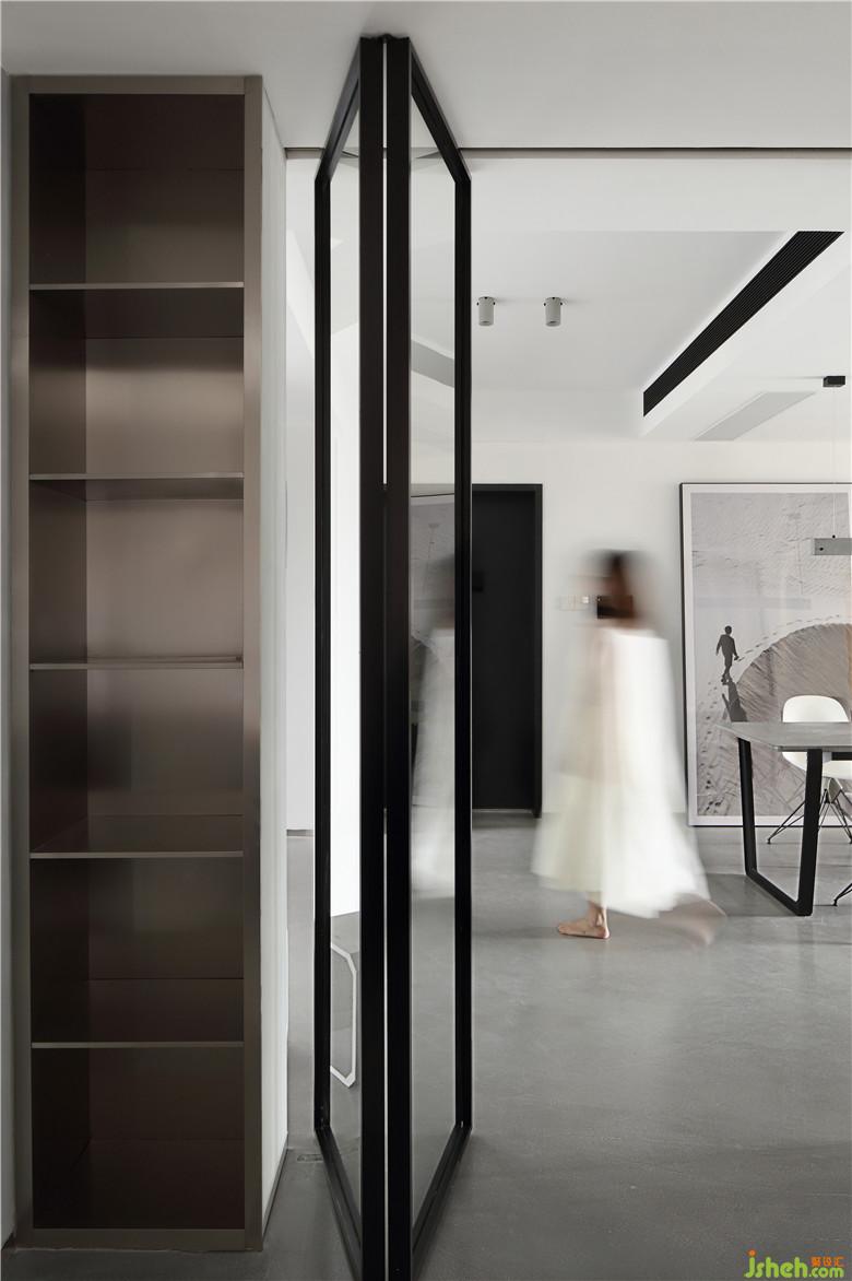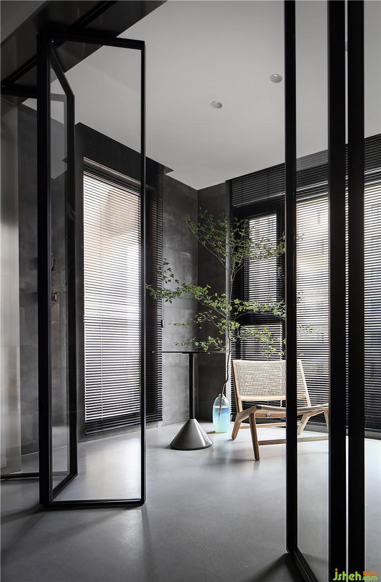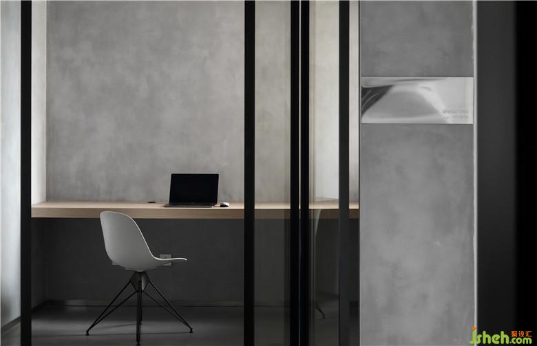 ▲書房墻面刷水泥漆,并沒有過多的擺設(shè),是斷舍離的極致追求。在玻璃折疊門的掩映下實(shí)木一字桌與伊姆斯餐椅相得益彰,是極簡與經(jīng)典設(shè)計(jì)的組合,門邊是刻了業(yè)主名字的曲面不銹鋼門牌。