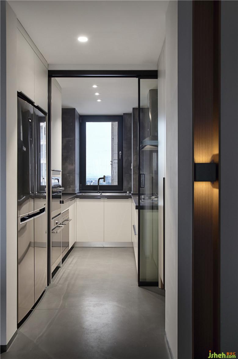 ▲廚房的玻璃移門前后,有柜體補(bǔ)充收納,并且將冰箱,蒸、烤箱等廚房家電嵌入其中,節(jié)省空間,讓小空間的整潔觀感更加舒適。廚房中白色的櫥柜襯托在淺灰的地坪漆與深灰的墻磚之中,顏色上適宜的節(jié)奏感可以讓小空間擺脫局促感。