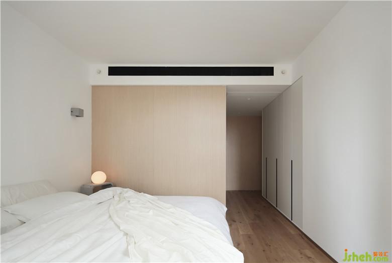 ▲由于墻體的改造與電視背景墻的外移,室內(nèi)設(shè)計(jì)師為主臥增添了衣柜收納空間,從入門開始到床的一側(cè)墻體皆以原木色的木飾面裝飾。臥房比起其他空間不變的是依然沒有過多的裝飾,多的是溫潤與放松的氣息。