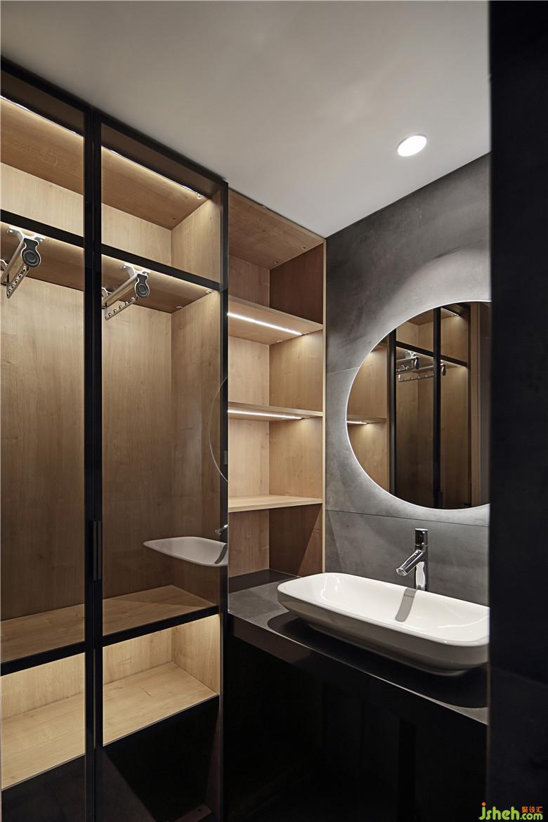 ▲主衛(wèi)空間的重新規(guī)劃增加了面積,讓收納功能十分充足,鋁框玻璃門(mén)搭配原木色柜體,柜體中都內(nèi)嵌燈帶,不僅補(bǔ)充了衛(wèi)生間光源、方便日常使用也烘托了私密的氛圍。