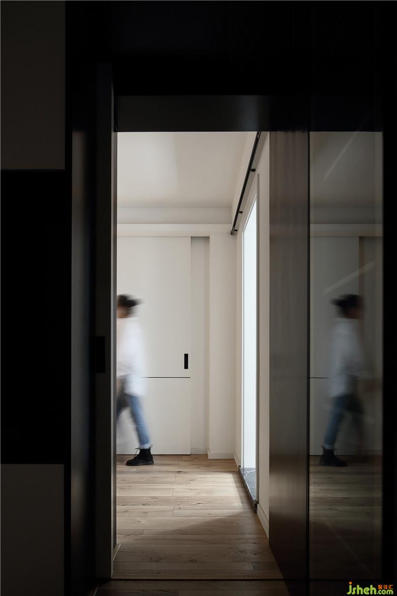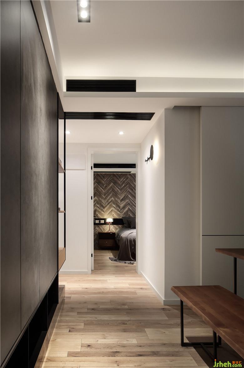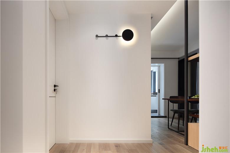 ▲玄關讓進門處有了遮擋,白色可以提升小空間的延伸感,造型有趣的黑色掛鉤點綴在白墻上,可以掛衣物,背后隱藏的燈條為夜間提供小夜燈的功能,方便日常生活,也提供了不可缺少的的裝飾感。