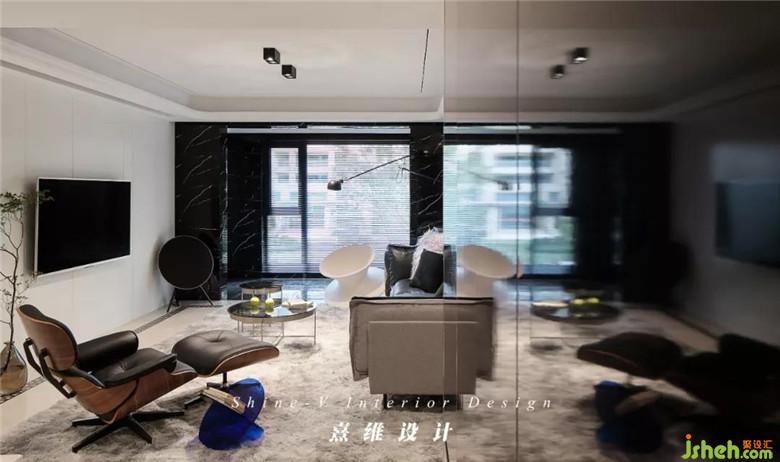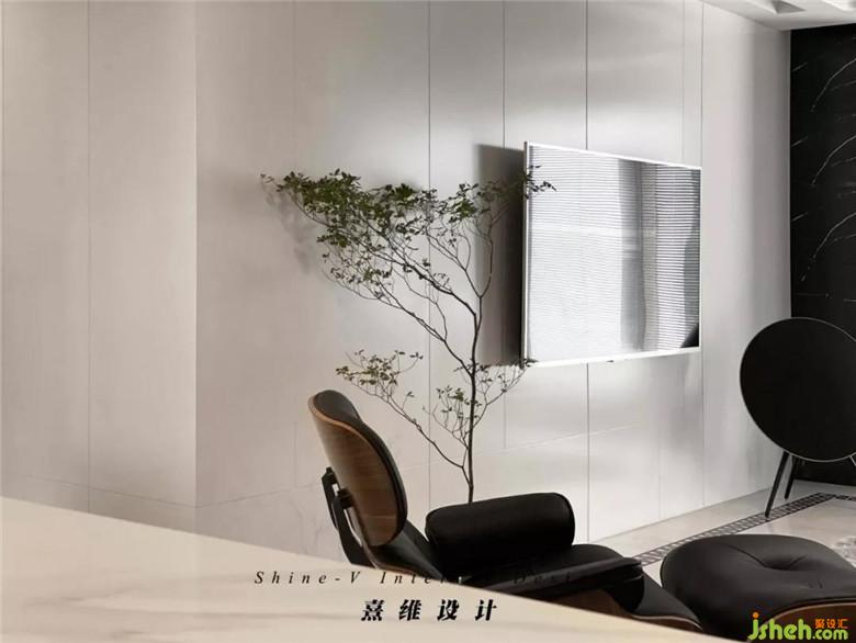皮質(zhì)的沙發(fā)輪廓分明,灰黑的配色與白色電視背景墻相對,視覺感更具張力。帶腳凳的伊姆斯椅,符合人體工程學(xué)的設(shè)計(jì)配合內(nèi)側(cè)的皮質(zhì)軟墊,是復(fù)古的輕奢兼具現(xiàn)代外型的自由體驗(yàn)。