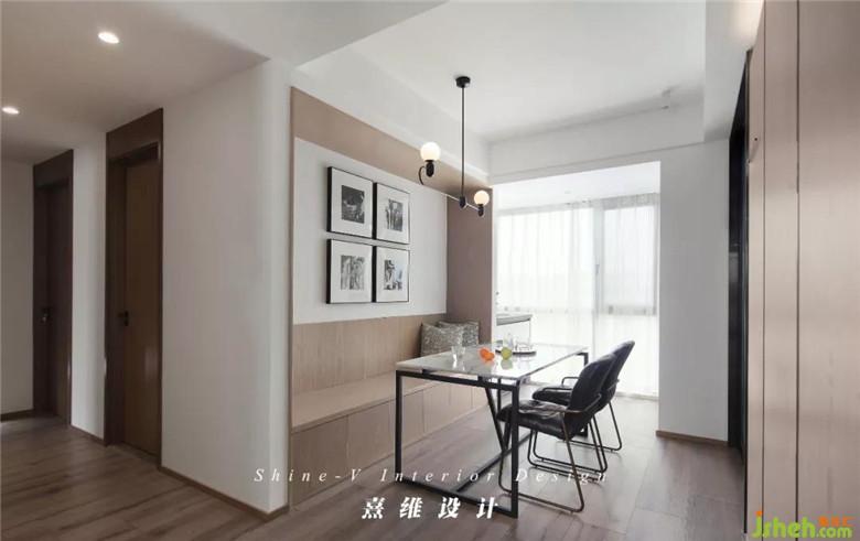 ▲原戶型過(guò)狹窄的餐廳,為了進(jìn)入廚房的動(dòng)線通暢,餐桌擺放選擇半卡座形式,節(jié)省空間也不會(huì)犧牲用餐時(shí)入座的舒適度。將卡座兩側(cè)墻體與小吊頂收口至與卡座齊平,空間更加規(guī)整起來(lái)。