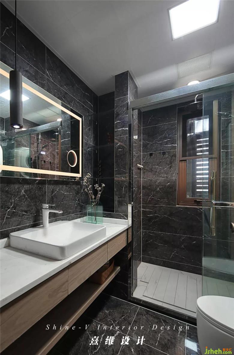 ▲深色瓷磚鋪貼的客衛(wèi),營(yíng)造出一種私密的氛圍。造型簡(jiǎn)潔,顏色清淡的浴室柜與壁龕涵蓋了衛(wèi)生間所需要的所以收納空間。裝修公司