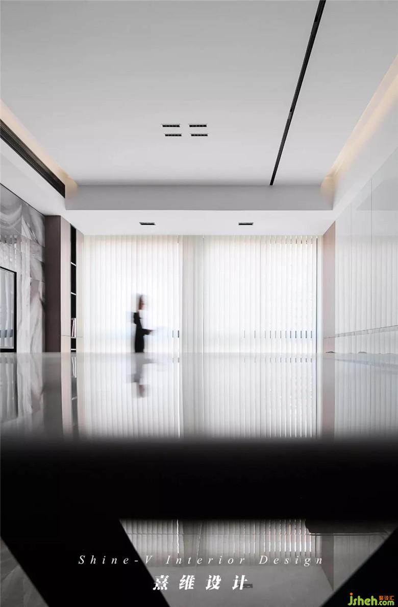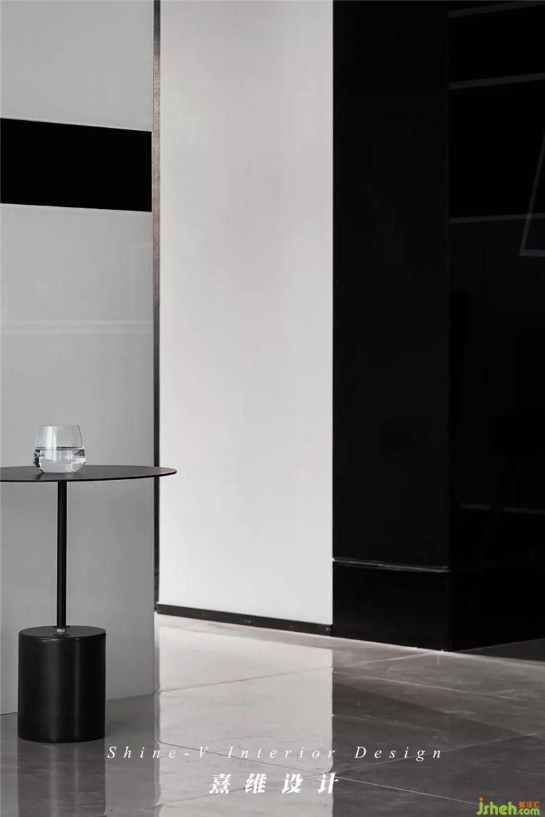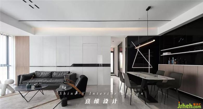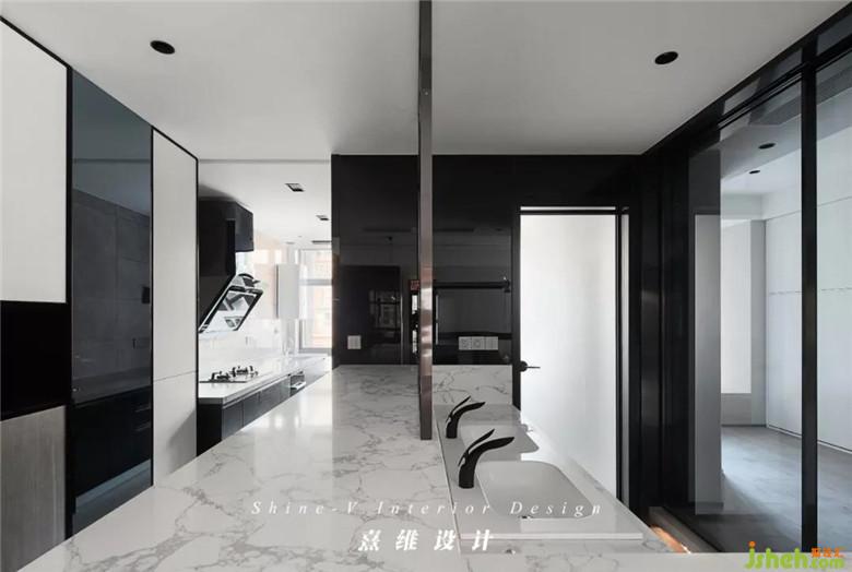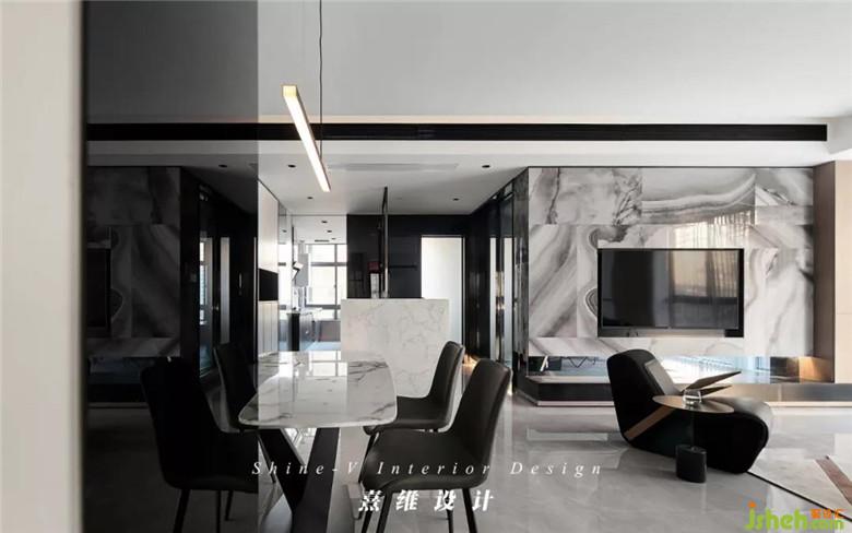 ▲餐廳距離廚房稍遠,顧及到南北方向縱深與原本的空間大小,不能選擇增加整面的柜體,于是裝修公司選擇沿墻面設(shè)計懸空柜,上層添加隔板,這樣無論是雜物還是常喝的酒都有合適的位置有序擺放,黑白空間的簡潔印象得以在日常生活中延續(xù)下去。餐桌沿用大理石元素,呼應(yīng)電視背景墻與廚房前的島臺,綻放在白色上的紋理是自然揮灑的痕跡,為餐廳摩登的墻面添上一筆細膩。