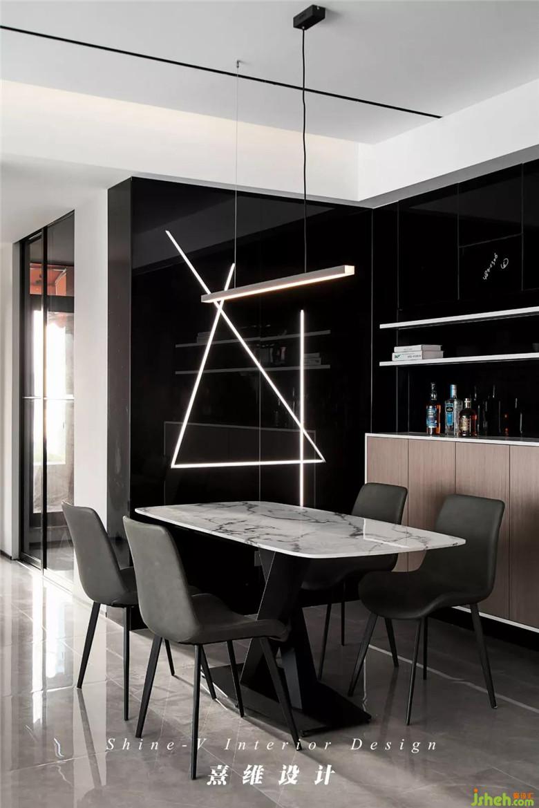 ▲餐廳與客廳距離較近,裝修公司為了強調(diào)功能界限,利用顏色區(qū)分開。如光線照入家中,經(jīng)過客廳,到了餐廳這邊便沉淀了下來。側(cè)面窄墻上的內(nèi)嵌燈條與如墨的黑色碰撞出時空交疊的科幻感,從暗色的深沉中跳脫出來,摩登而現(xiàn)代。