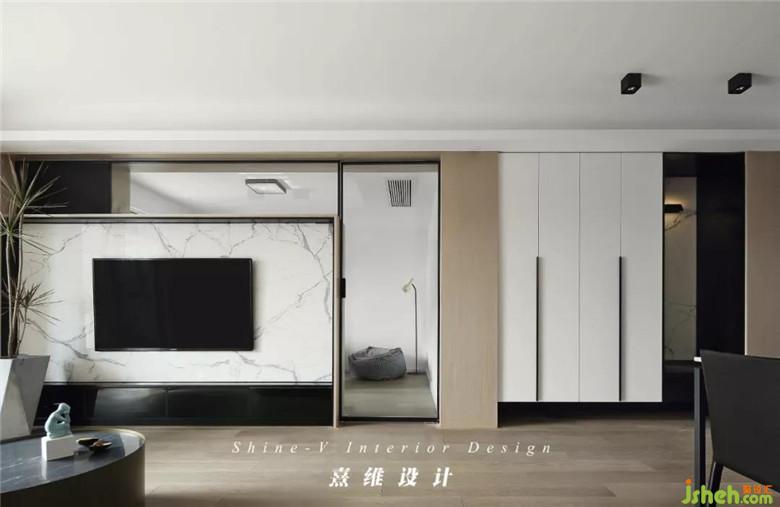 ▲電視背景墻的塊面是黑白分明,大理石紋路為清爽、裝修公司利落的配色增添細節(jié),立在角落里的千年木姿態(tài)舒展帶來生機。