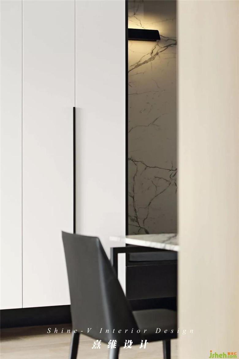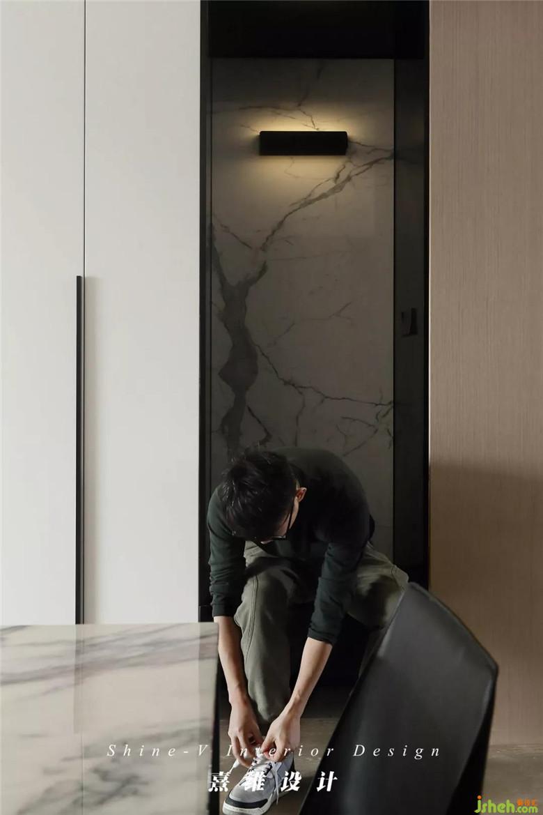 ▲柜體之間空出一截作為換鞋凳使用,內嵌與電視背景墻同材的裝飾板,這種呼應讓空間內的聯(lián)系更加緊密融洽。大理石裝飾板上添置一處隱藏光源,雖不顯眼,卻可以守候在晚歸的夜里。