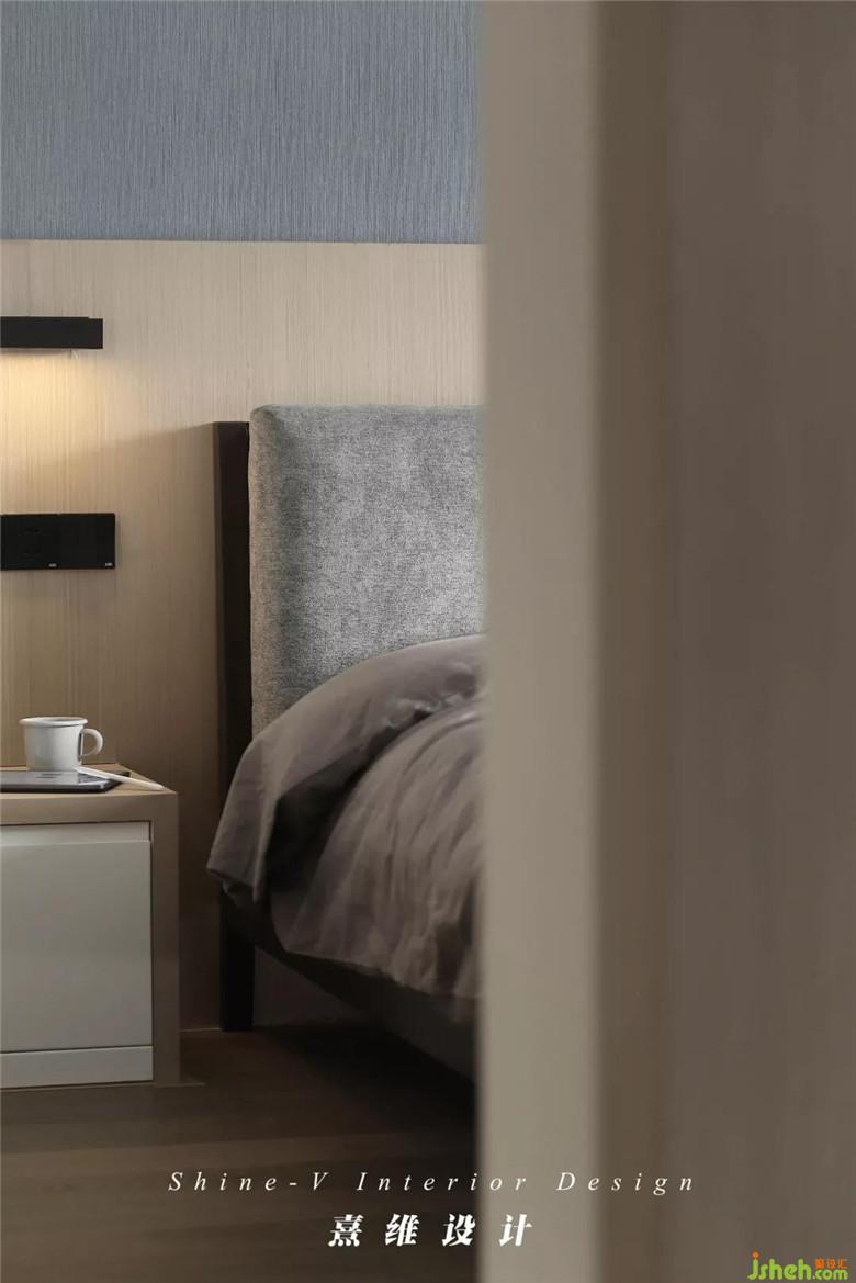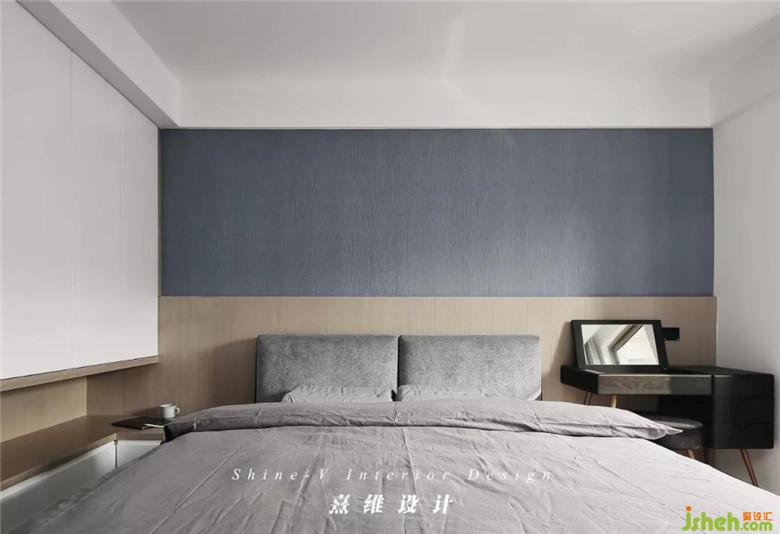 ▲相比其它空間,主臥的樣貌傾向于更輕柔自在的意態(tài),依然是原木色,被作為齊腰線的護(hù)墻板沿用至主臥床頭,木色之上鋪貼淺灰藍(lán)墻布,會(huì)呼吸的溫柔從顏色、質(zhì)地中舒展出來(lái),是微風(fēng)攜光在床畔停駐,凝成日常不言而喻的愜意。