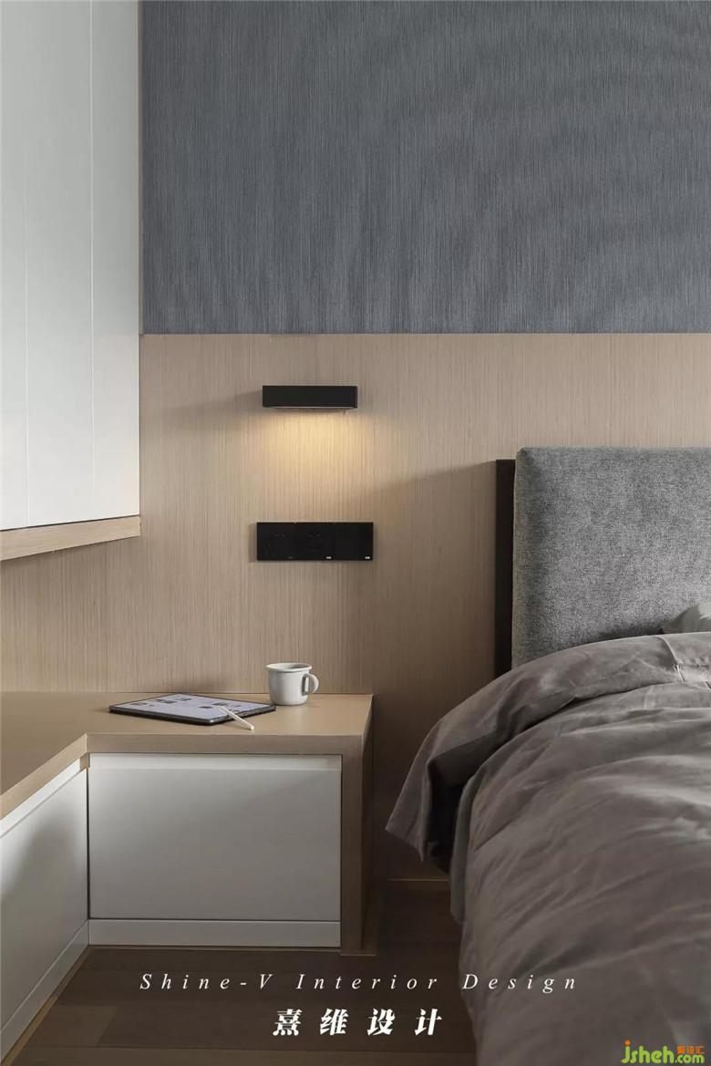 這里的床頭柜不是單獨(dú)的個(gè)體,床邊地柜轉(zhuǎn)角朝床頭靠近,完成了所需功能。