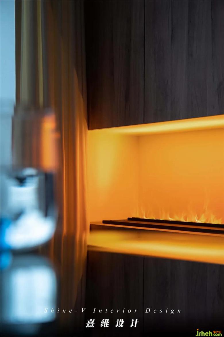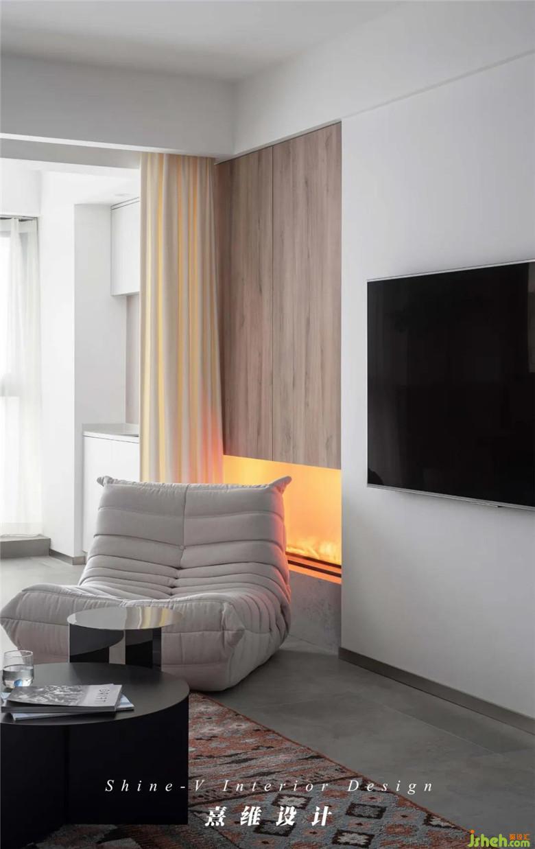 ▲裝修公司將美觀和實(shí)用以最簡約、流暢的方式在電視背景墻處表達(dá)出來。配合色彩純凈的調(diào)性,無需額外添置電視柜,用淺胡桃木色的柜體以吊柜的形式放置在左上角,客廳需收納的物品被斂于其中,以自然、素樸的一塊木色縮影摒除白色的單調(diào)印象,底部安裝的霧化壁爐,火光裊裊。此時(shí),形形色色、個(gè)中滋味盡可消融于白之中。